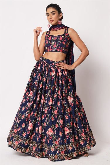 Dazzling Navy Blue Color Printed Lehenga In Art Silk Fabric