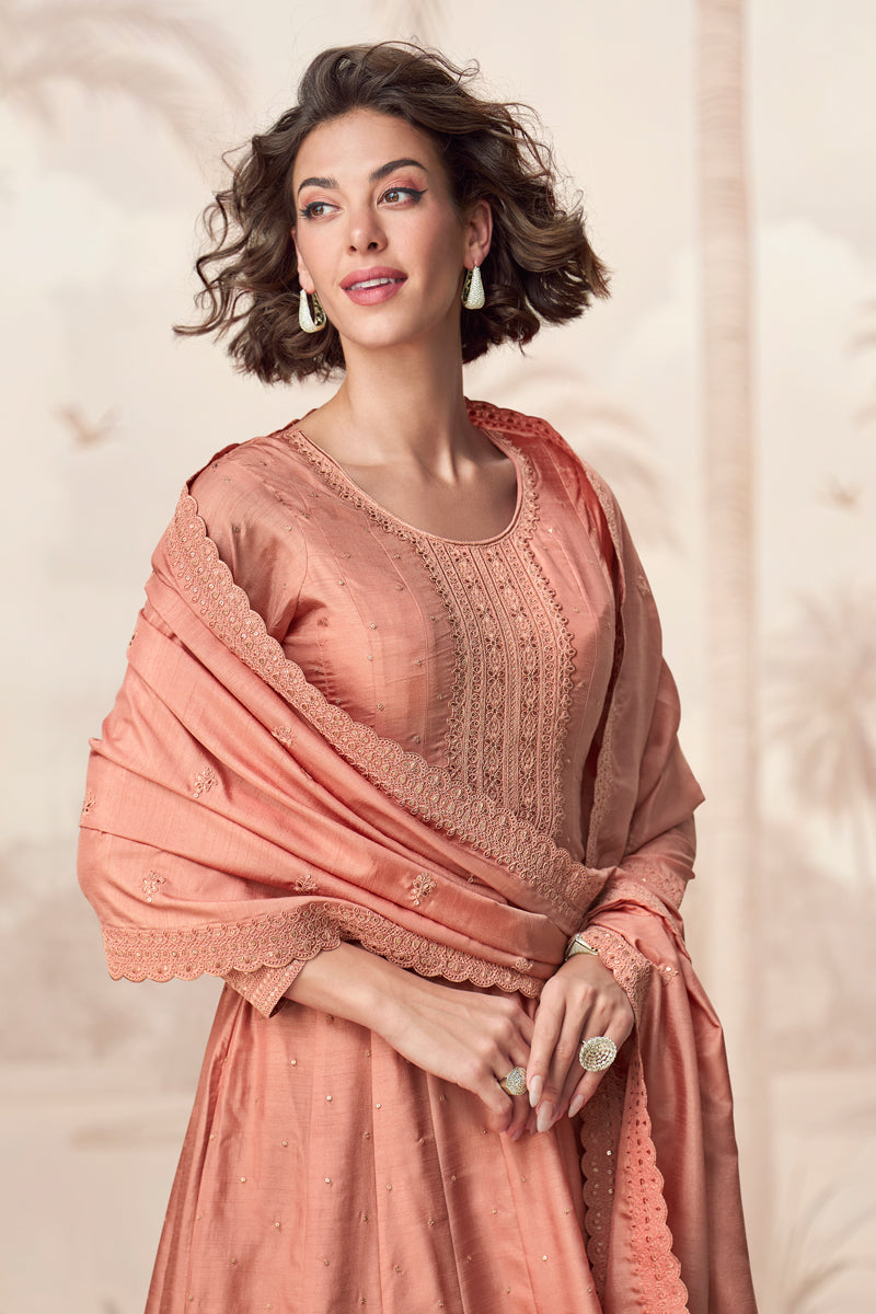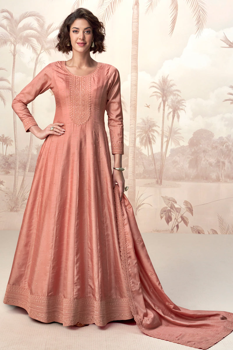 Designer Peach Color Silk Floor Touch Readymade Gown With Dupatta