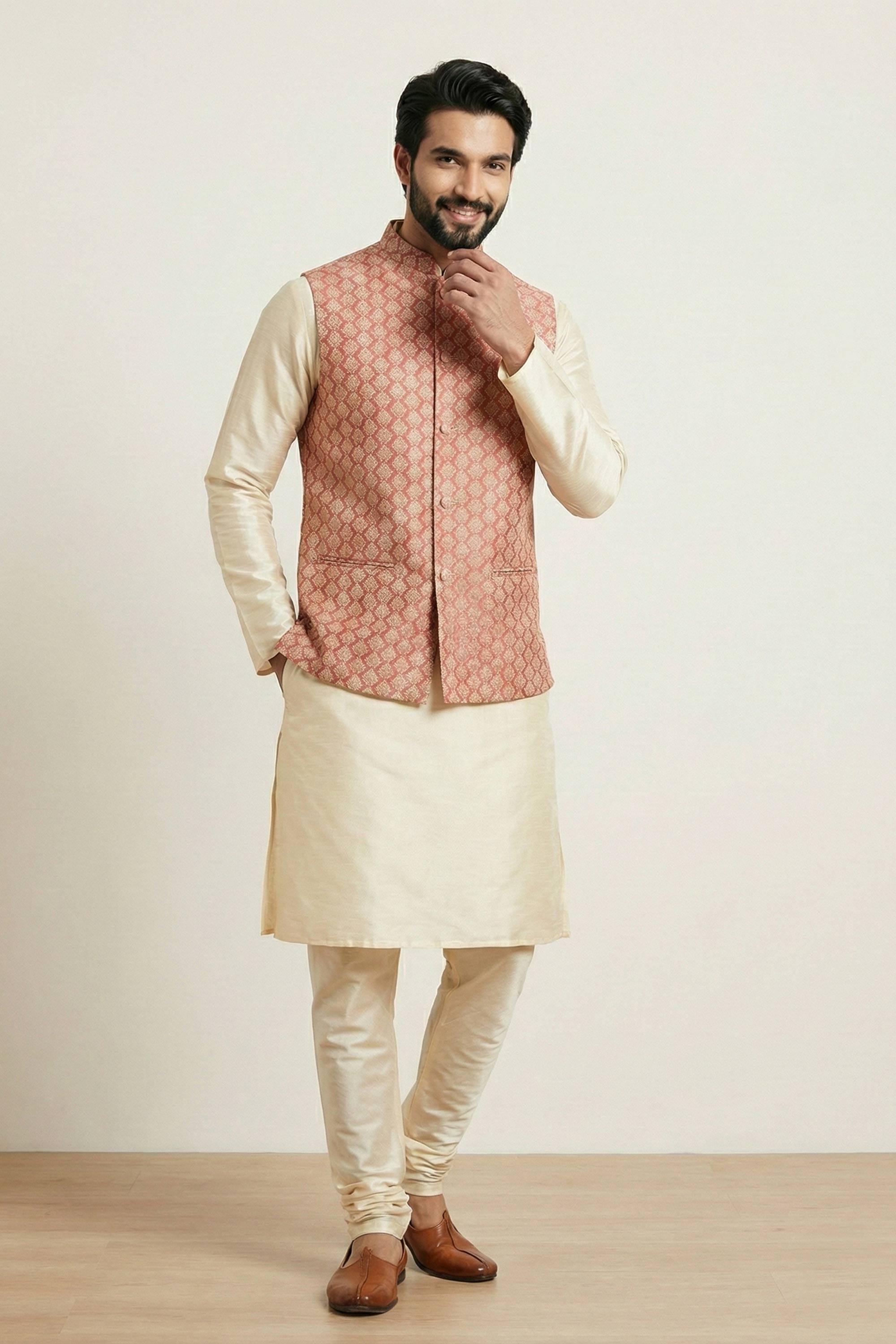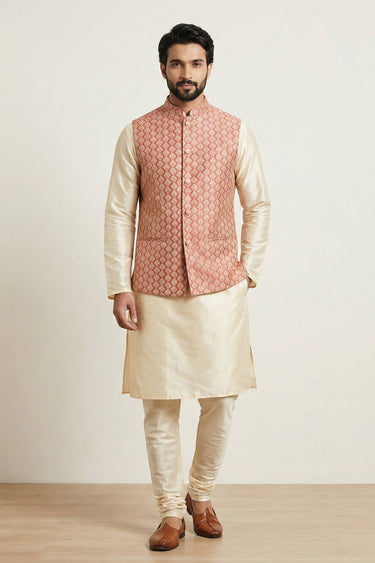 Dhupion Fabric Beige Function Wear Readymade Kurta Pyjama With Designer Jacket For Men