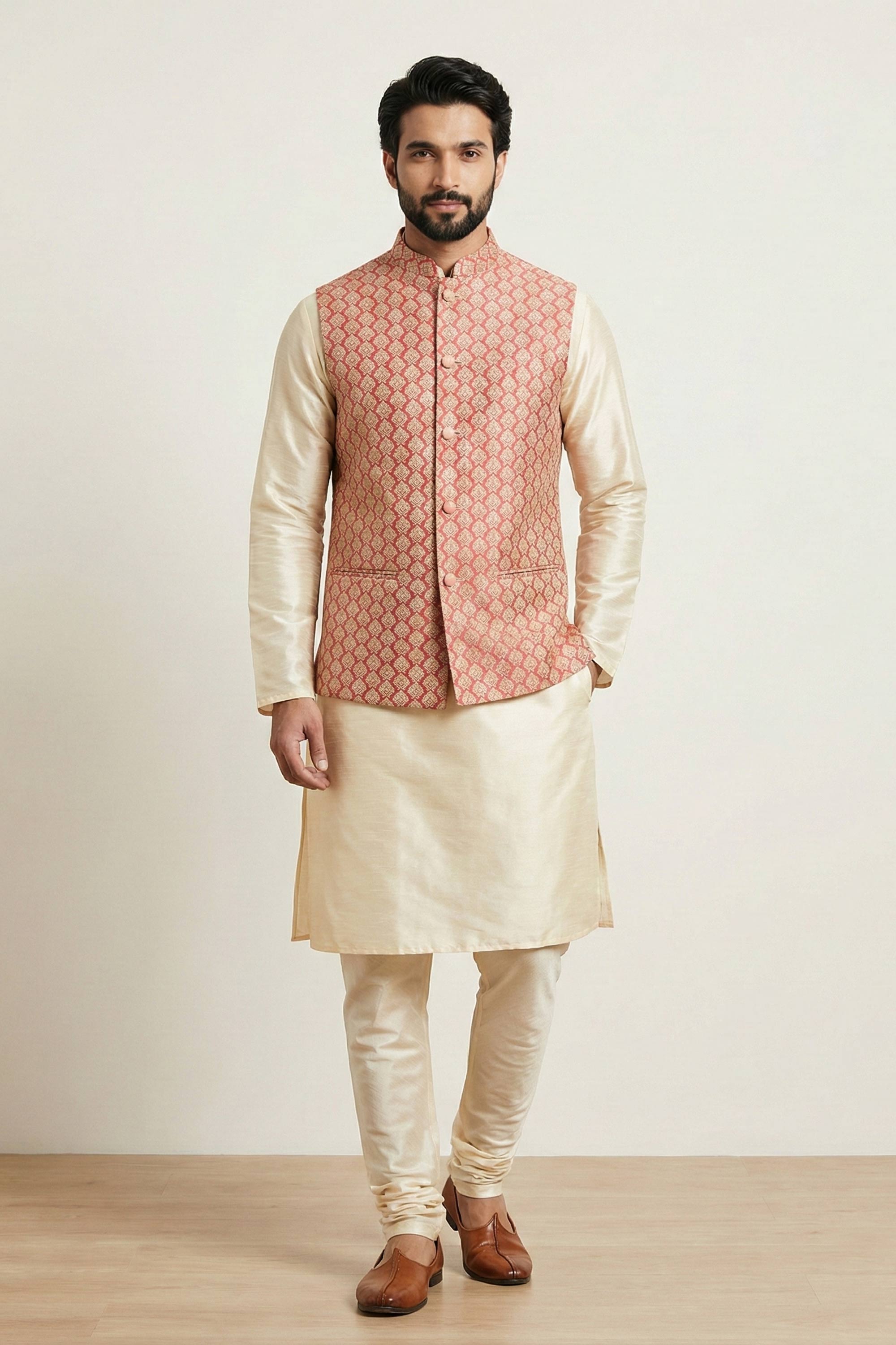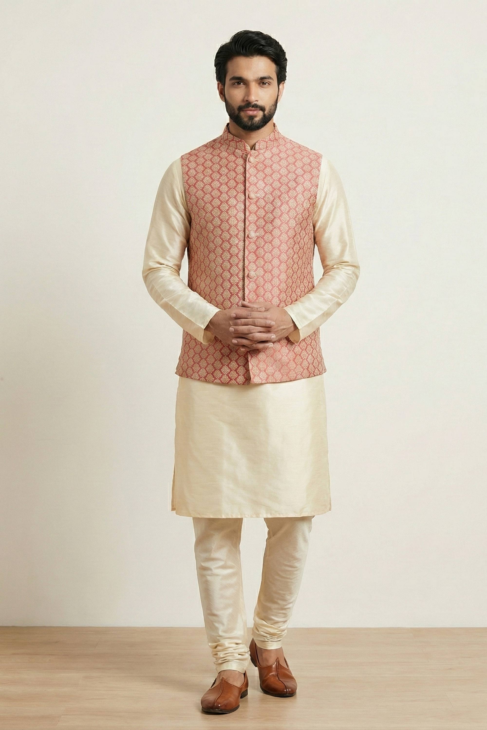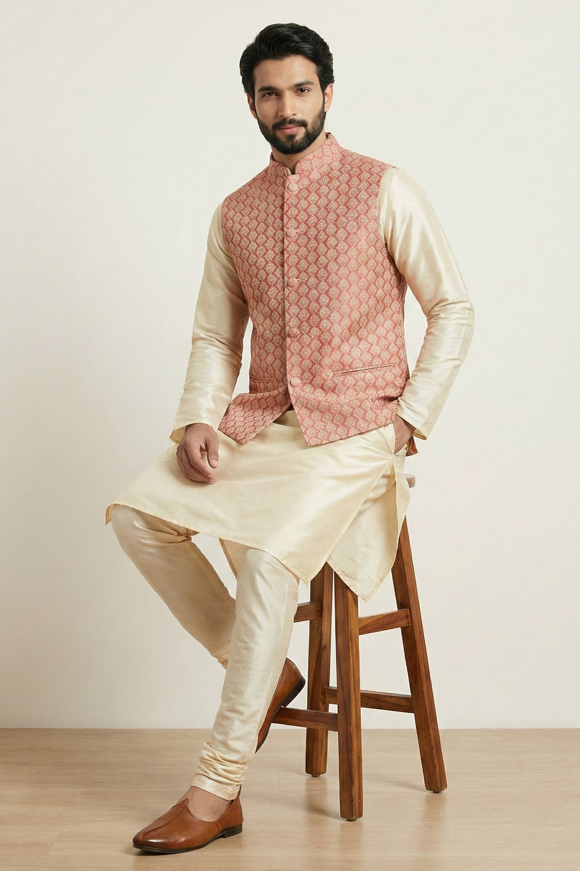 Enhance your festive wardrobe with this sophisticated Readymade Kurta Pajama Set with Designer Jacket for Men. Crafted from premium Dhupion fabric, the kurta and pyjama offer a rich texture and comfortable fit. The look is elevated with a stylish Jacquard Silk designer jacket, adding elegance and a refined finish. Presented in a rich color, this outfit is perfect for functions and special occasions, combining traditional charm with modern appeal. Please note that slight color variations may occur due to digital photography.