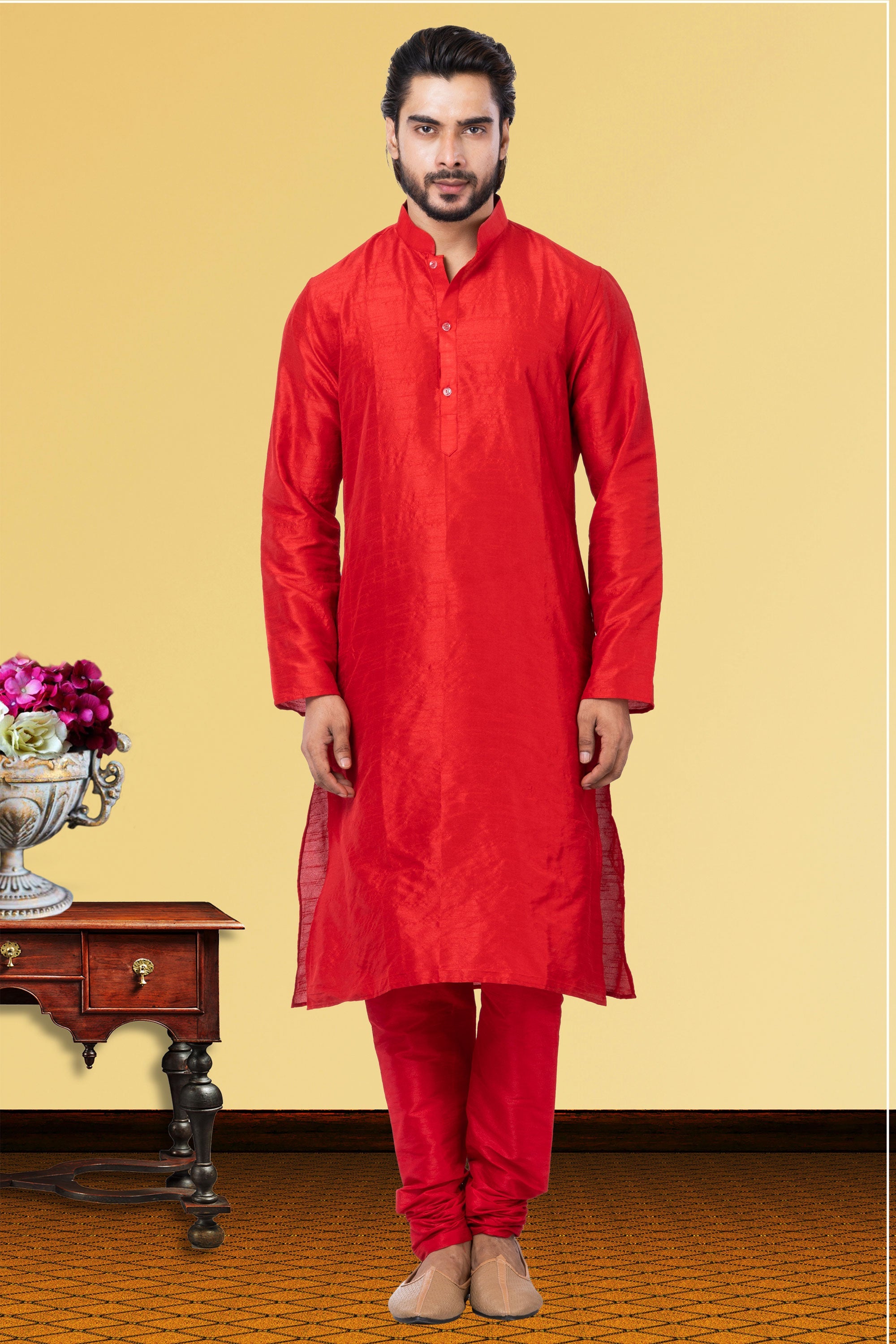 Dhupion Fabric Wedding Wear Kurta Pyjama For Men In Red Color