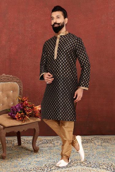 Dhupion Silk Fabric Readymade Kurta Pyjama For Men In Black Color