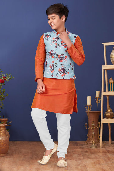 Dhupion Silk Orange Color Occasion Wear Trendy Readymade Boys Kurta Pyjama With Jacket