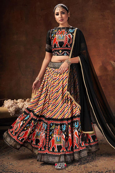 Digital Patola Printed Work On Black Color Sangeet Wear Gorgeous Lehenga In Art Silk Fabric
