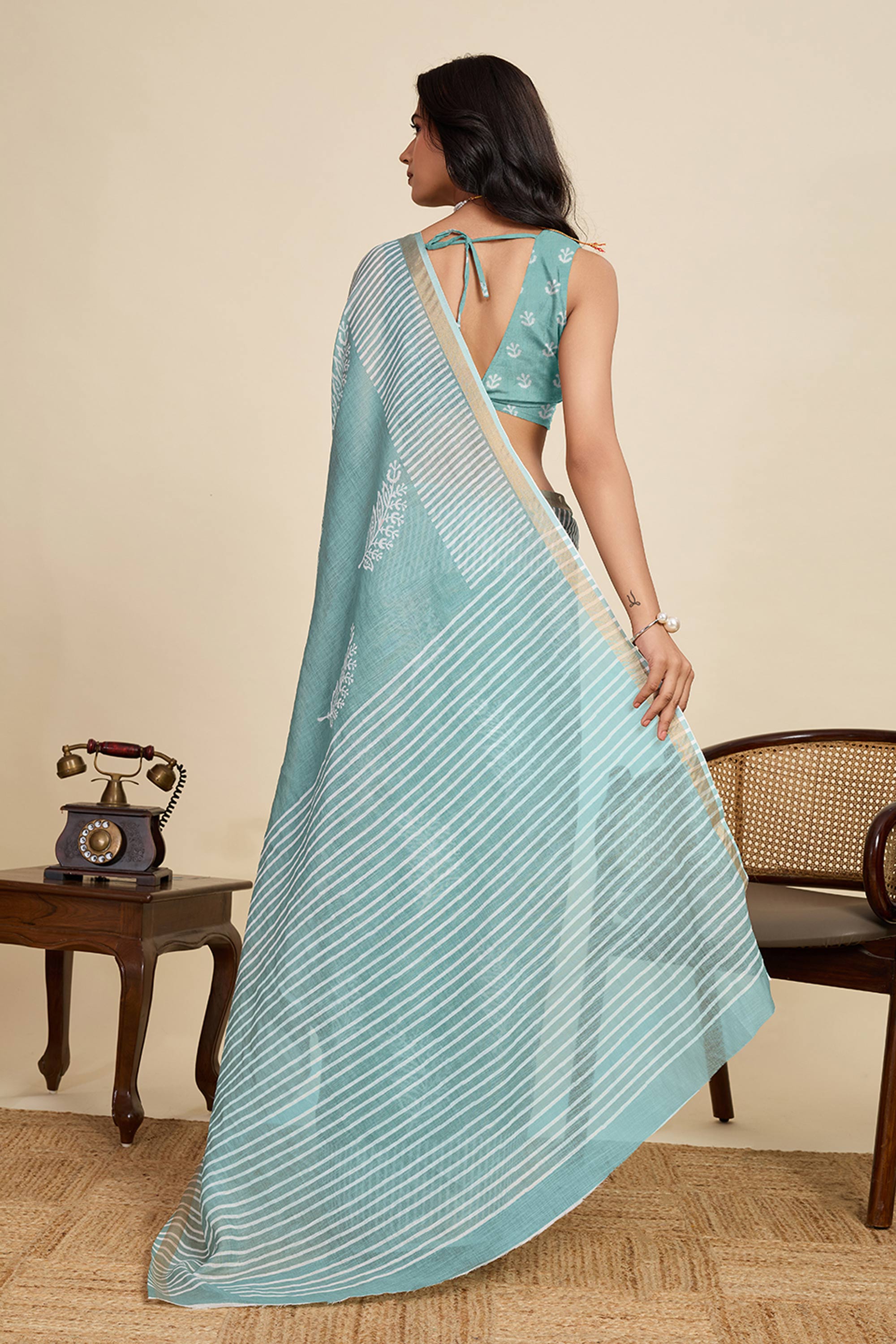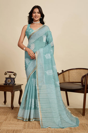 Digital Printed Light Cyan Linen Daily Wear Saree