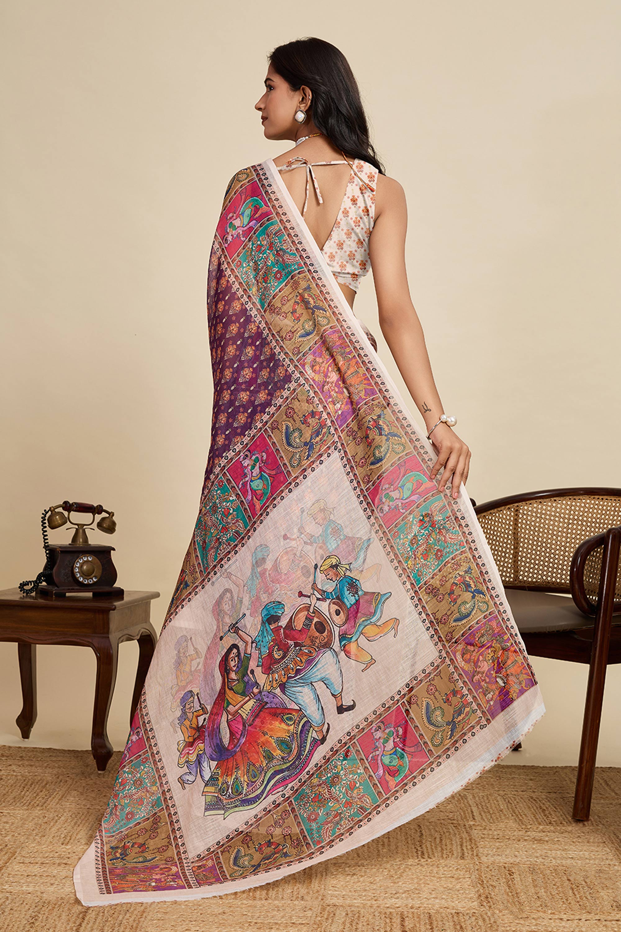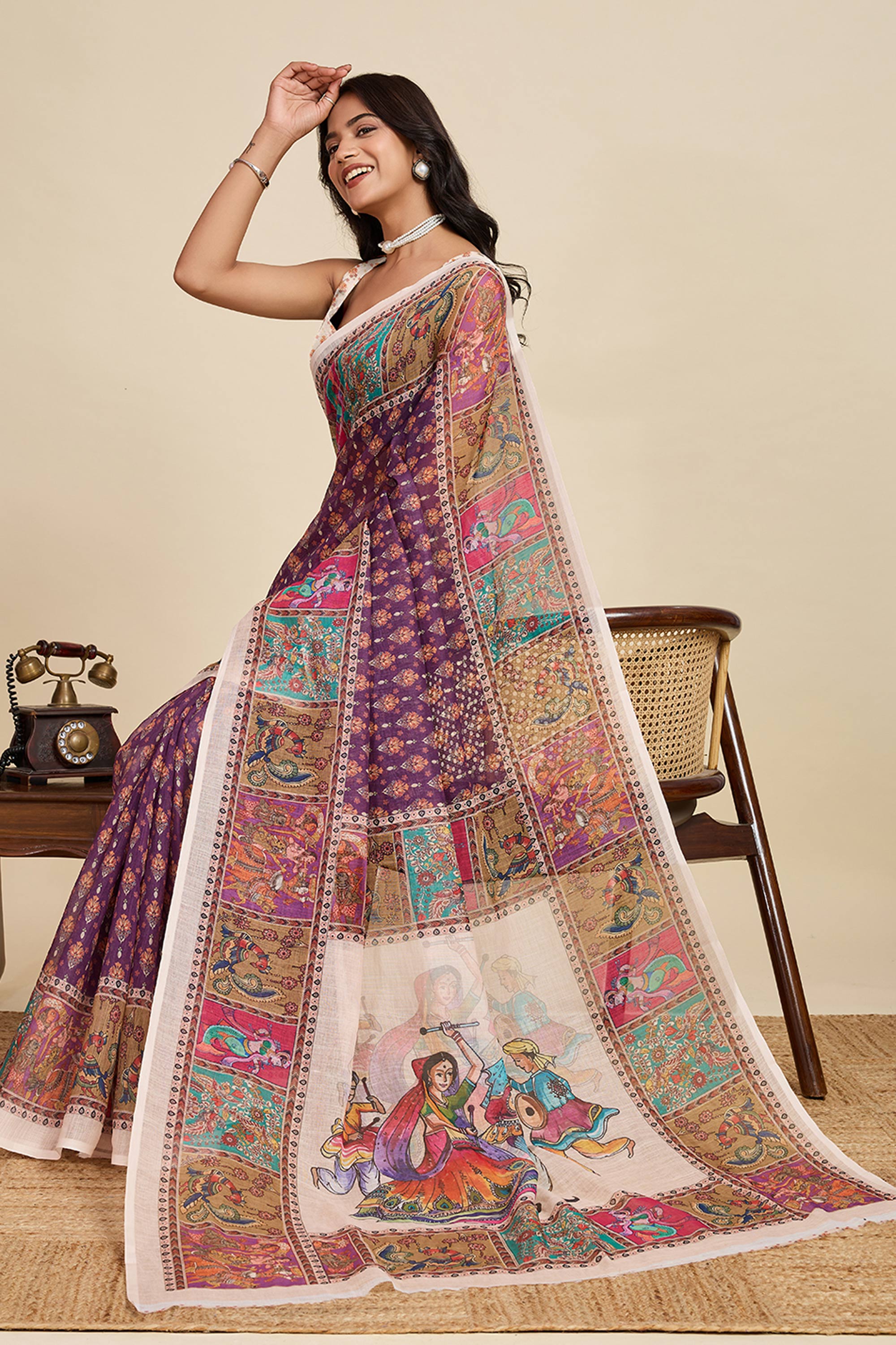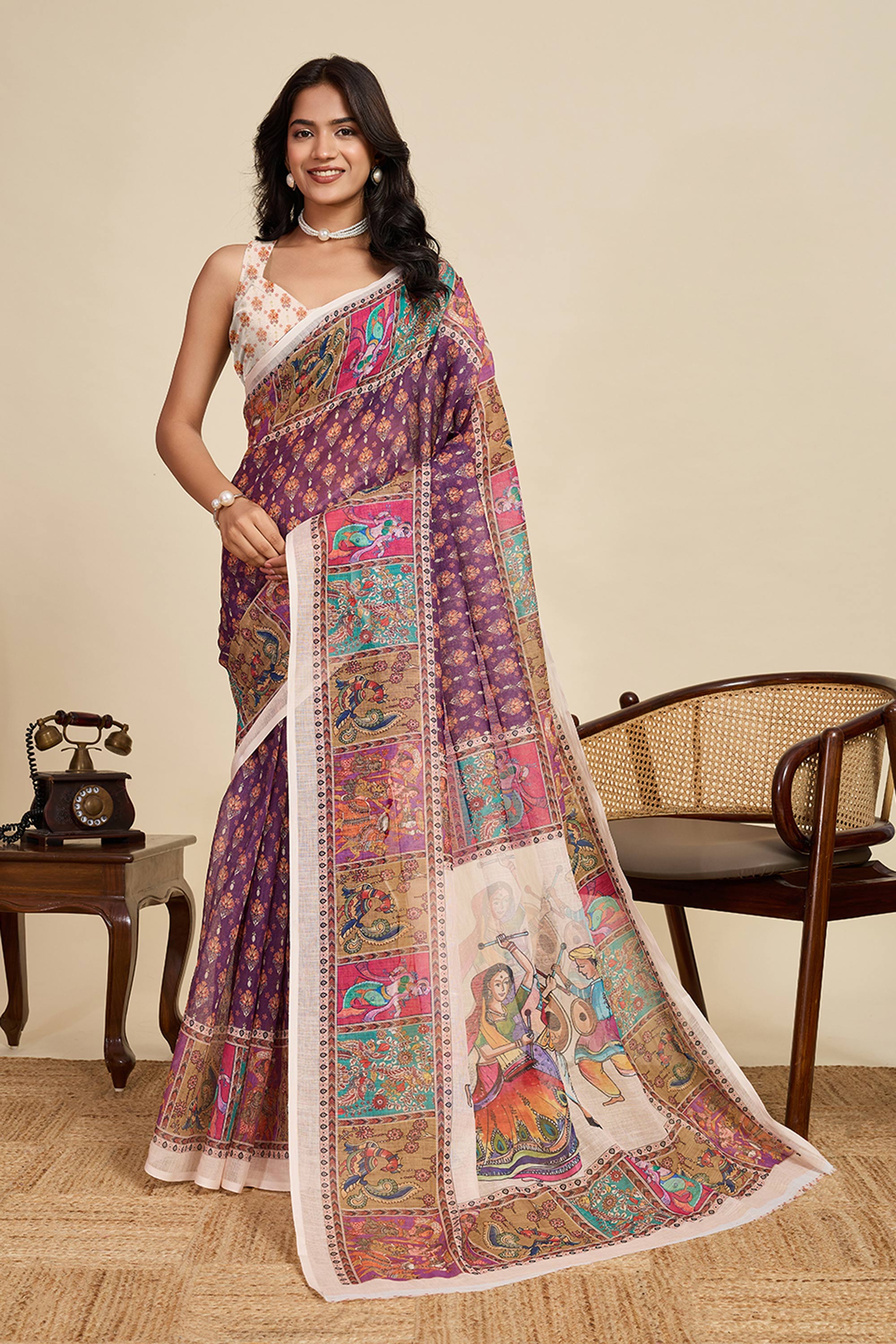 Digital Printed Linen Purple Casual Wear Saree
