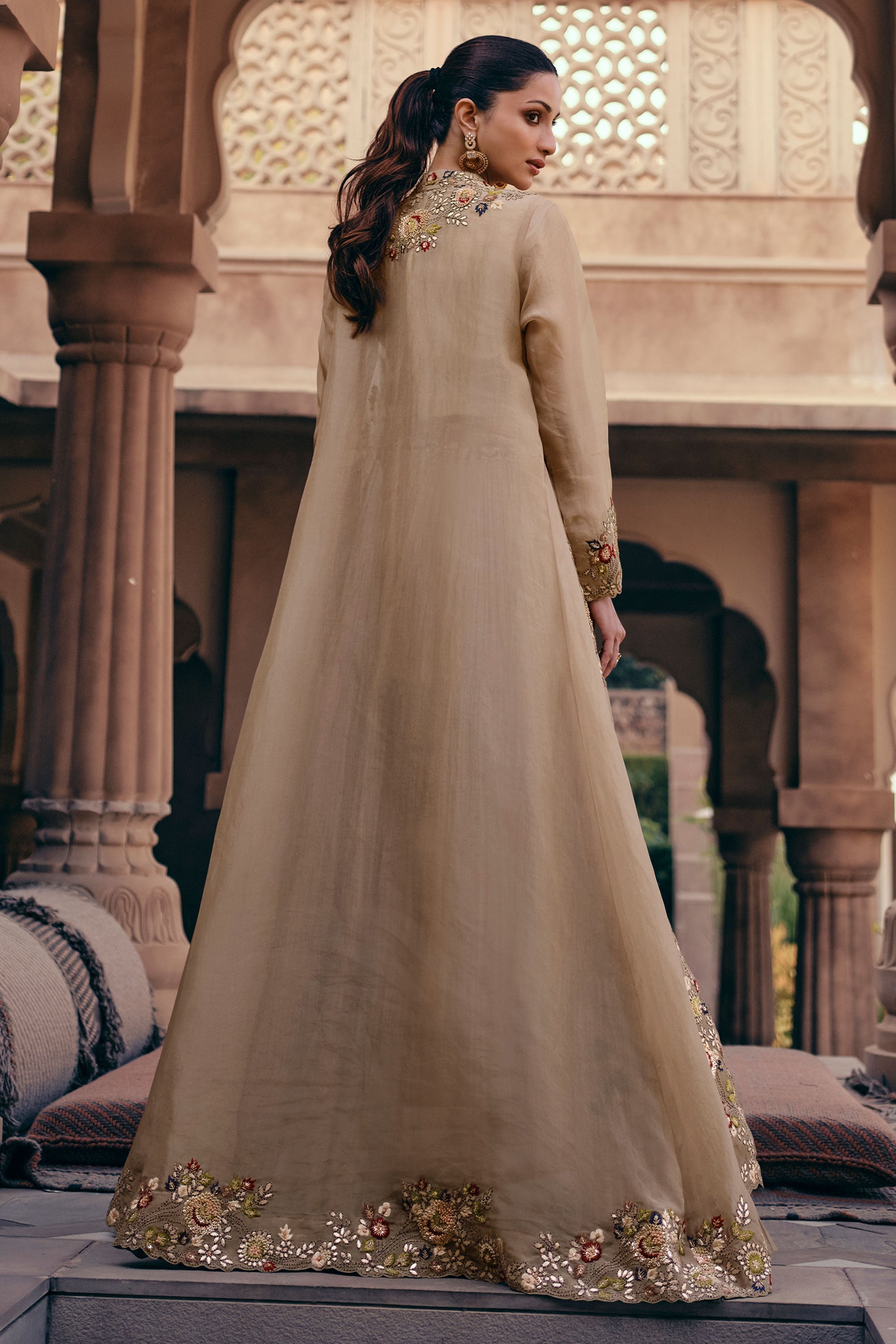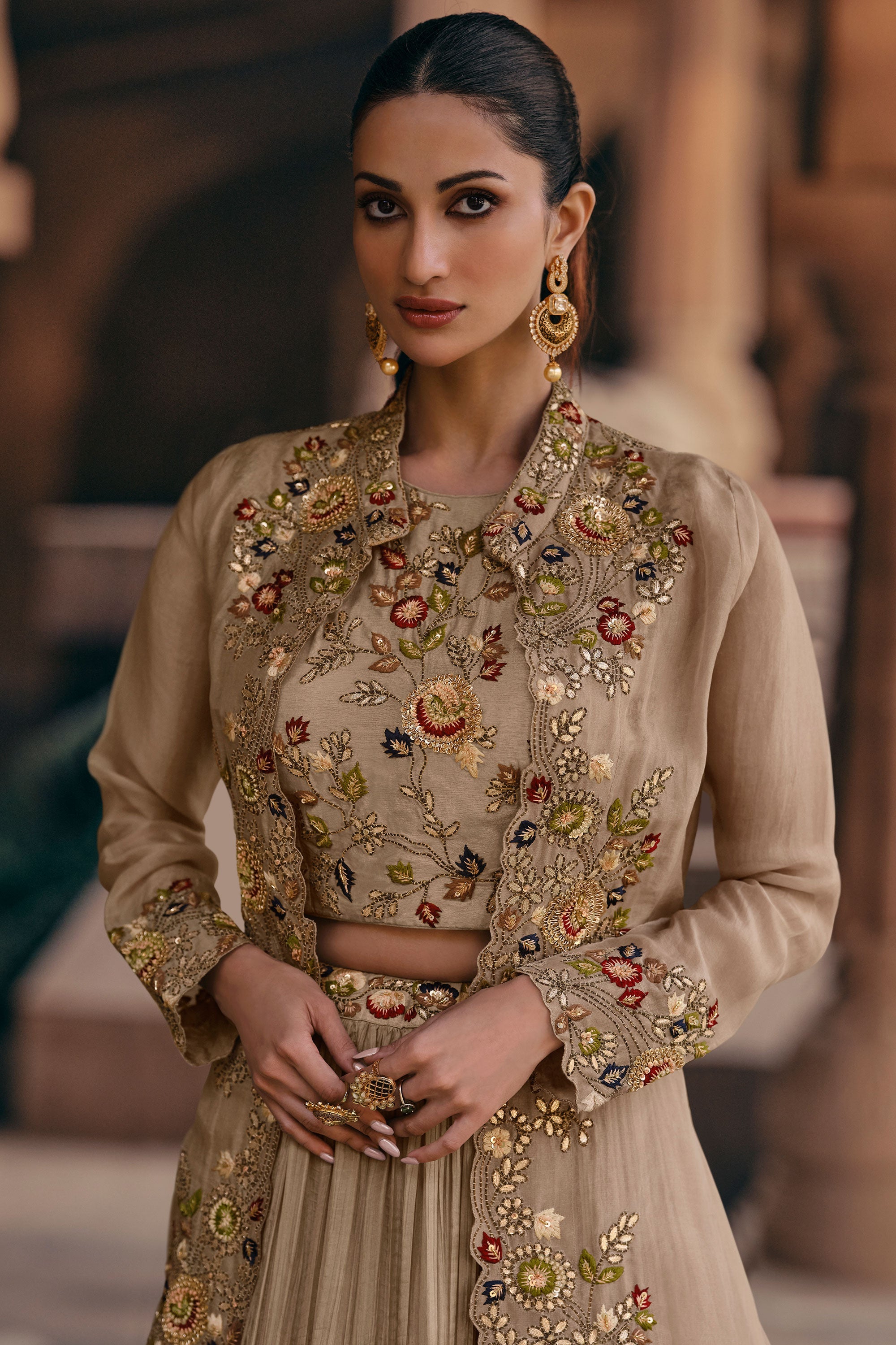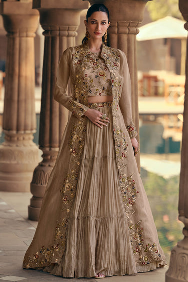 Diksha Singh Exclusive Beige Color Crop Top Lehenga With Jacket In Georgette Fabric