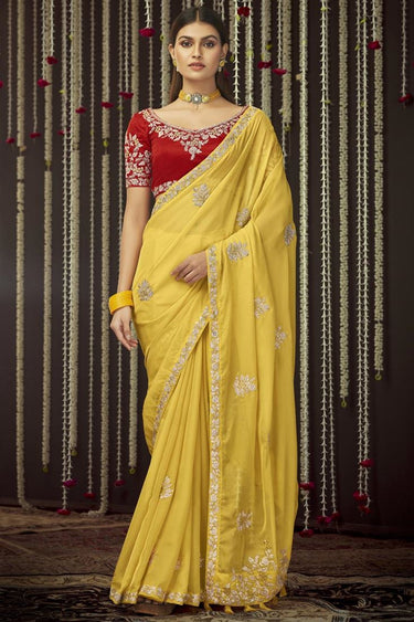 Divine Mustard Color Organza Fabric Party Wear Border Work Saree