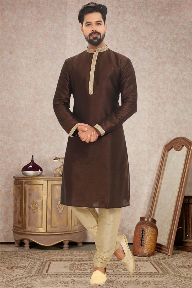 Dupion Silk Fabric Brilliant Festival Wear Kurta Pyjama In Brown Color