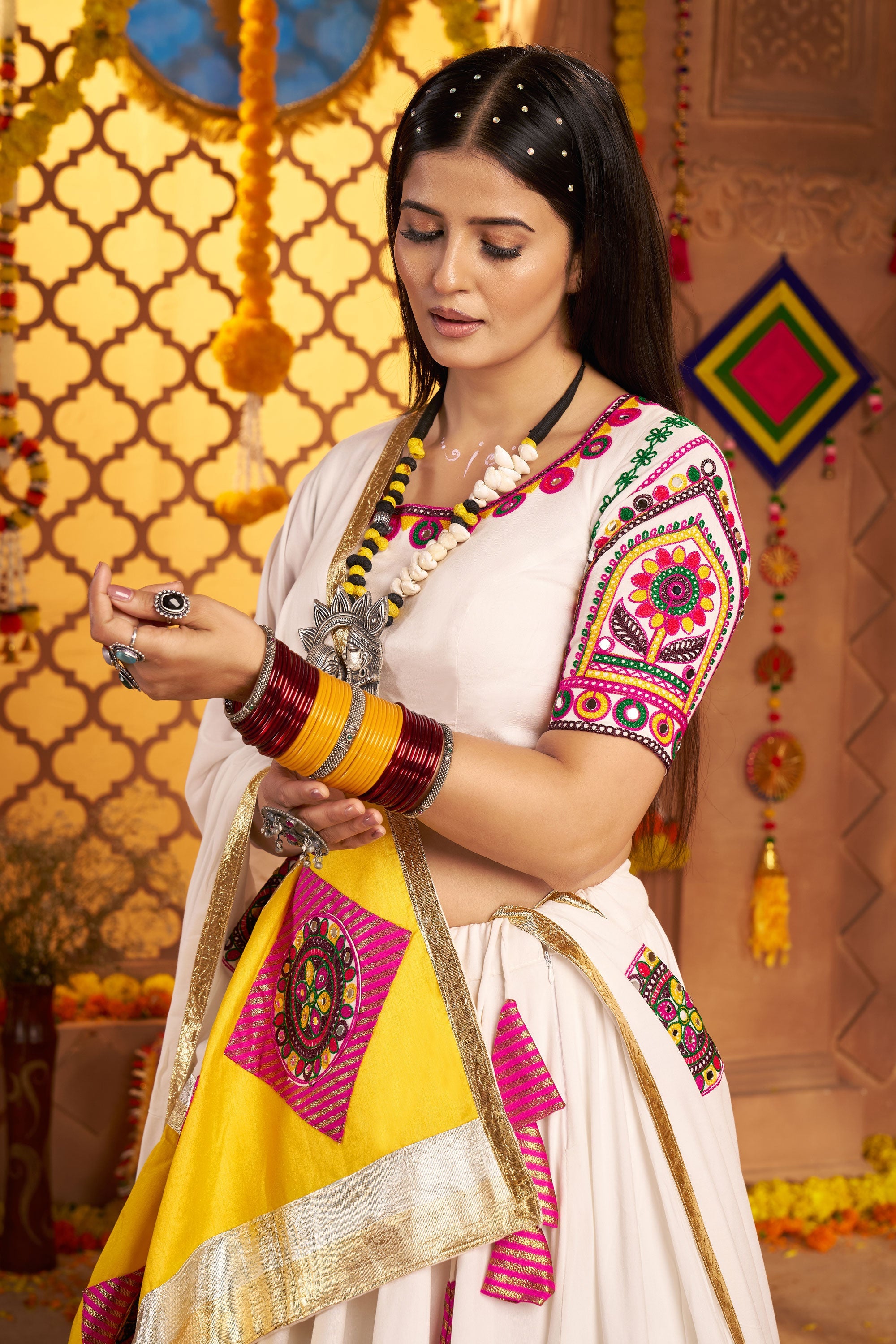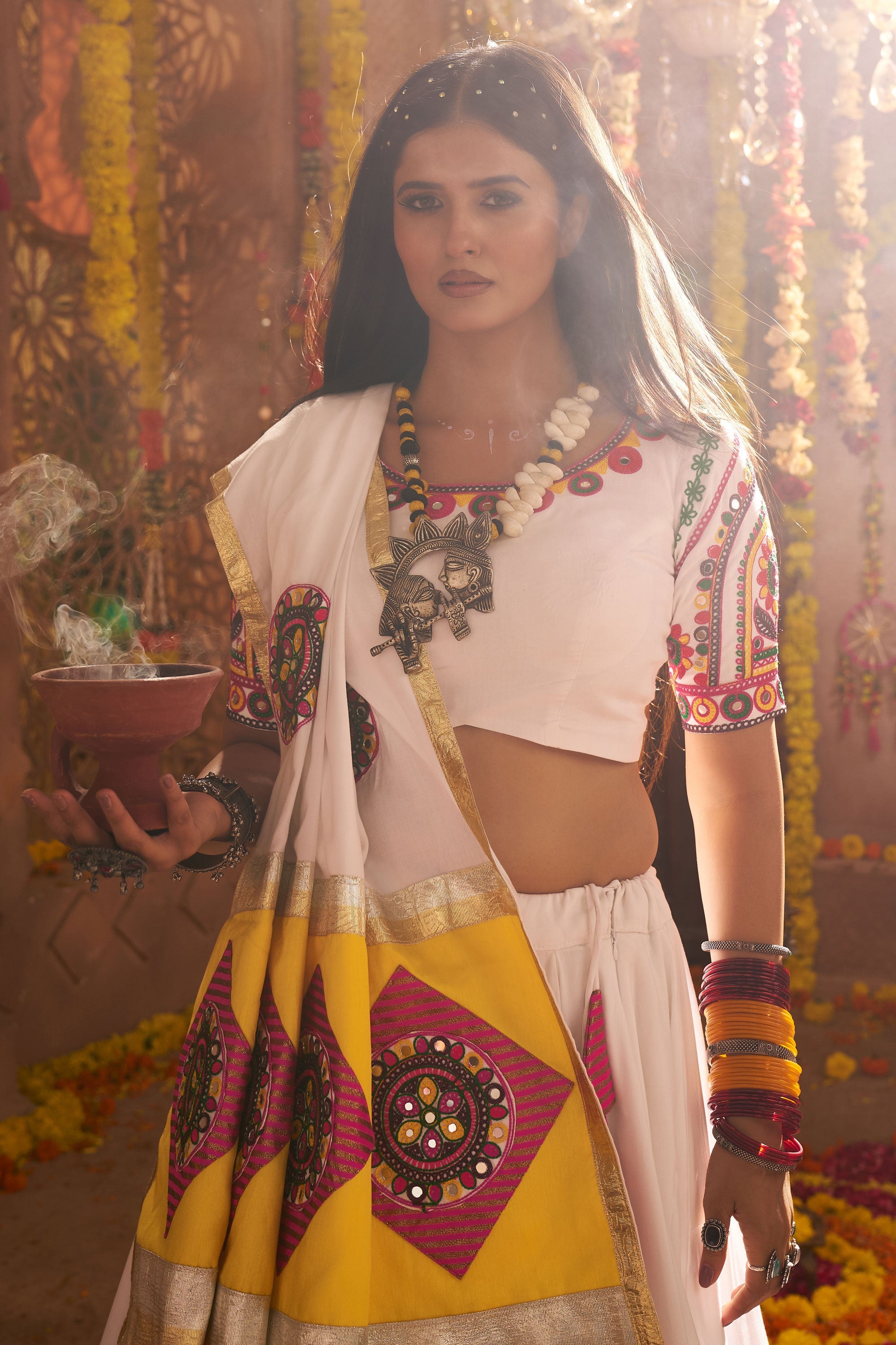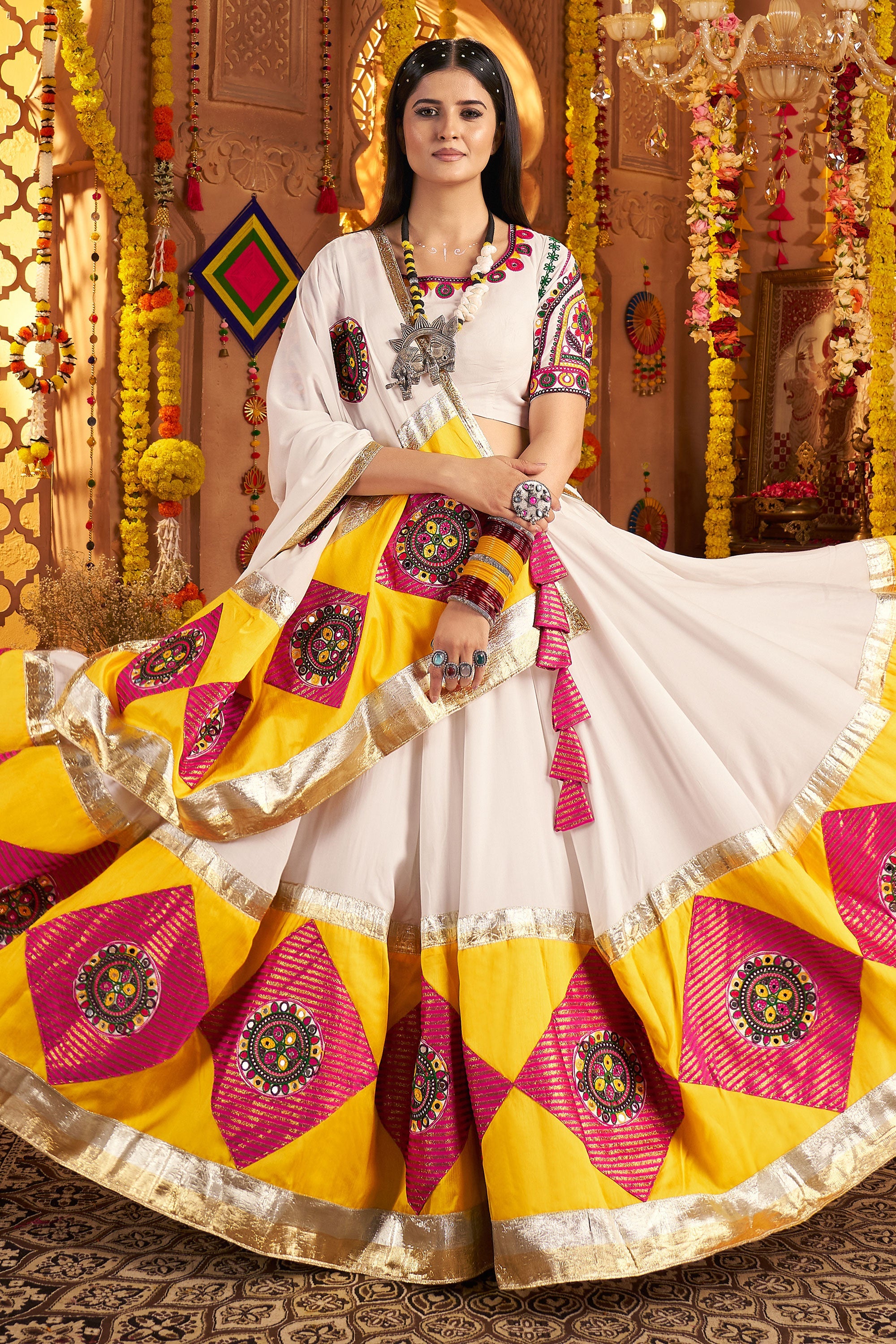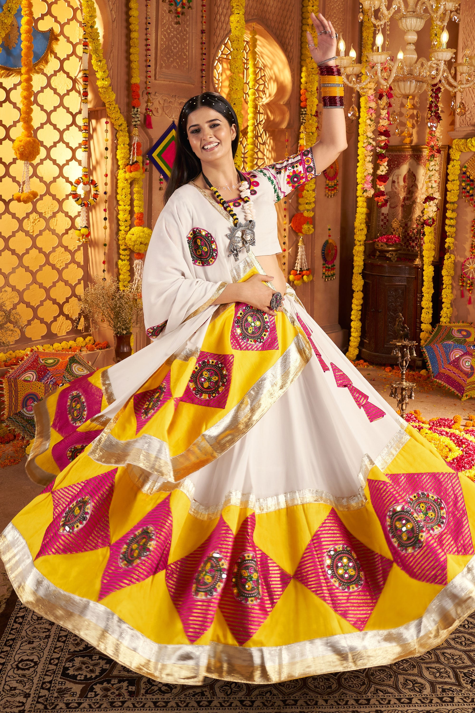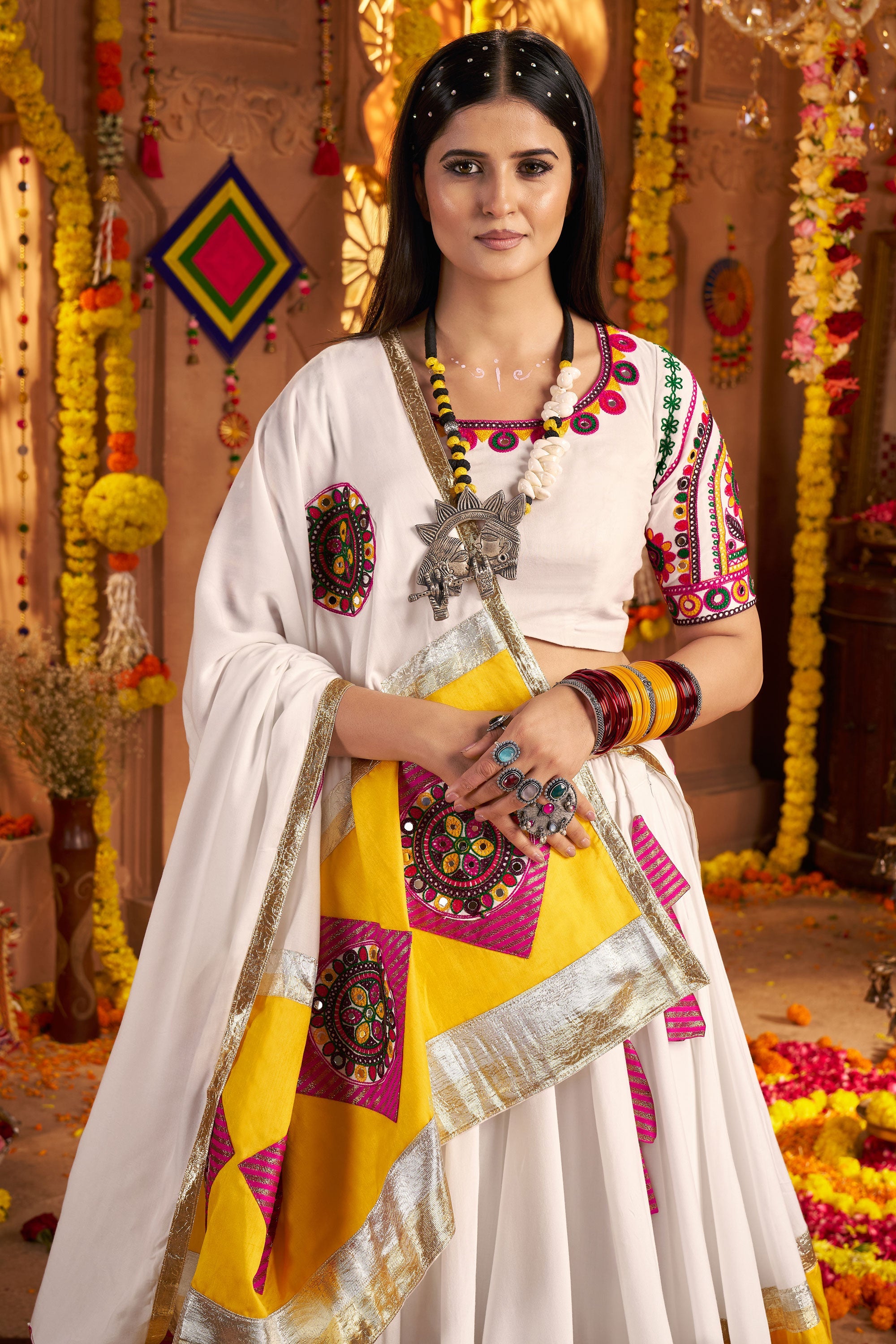 Get festive-ready with this eye-catching Navratri Lehenga Choli that showcases rich mirror work on premium-quality fabric. Designed to bring out your elegance, it boasts a vibrant color palette, perfect for making a statement during Garba nights or any celebration. Lightweight yet detailed, this outfit combines style and comfort, making it an essential addition to your festive collection. Dance, twirl, and glow with grace in this stunning piece.