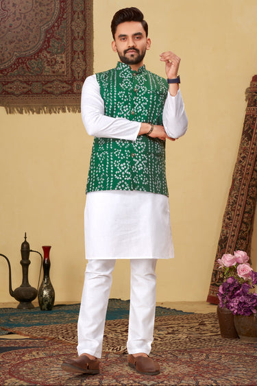 Elegant Cotton Fabric Green Color Readymade Kurta Pyjama With Bandhani Print Jacket Set