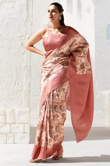 Elegant Digital Printed With Zari Border Saree In Peach Color