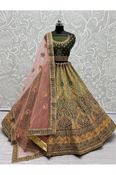 Elegant Net Fabric Wedding Bridal Lehenga in Green Color With Embroidered Work