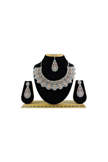 Embellished Peach Color Alloy Material Necklace with Earrings and Mang Tikka