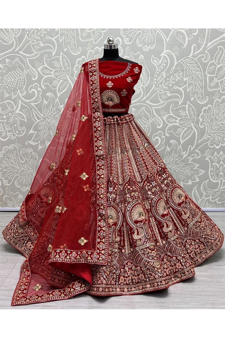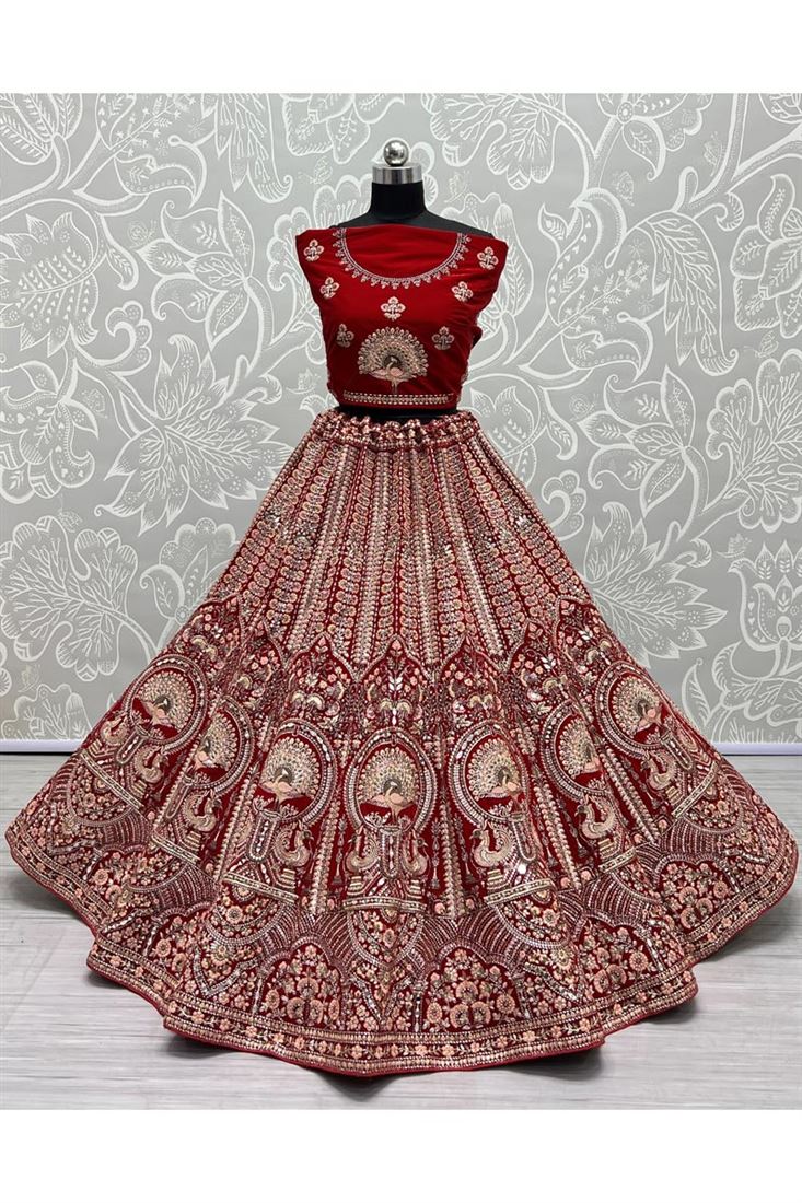 Embellished Red Color Thread Embroidered Velvet Bridal Lehenga