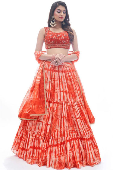 Embellished Thread Embroidered Work On Rust Color Function Wear Lehenga In Jacquard Fabric
