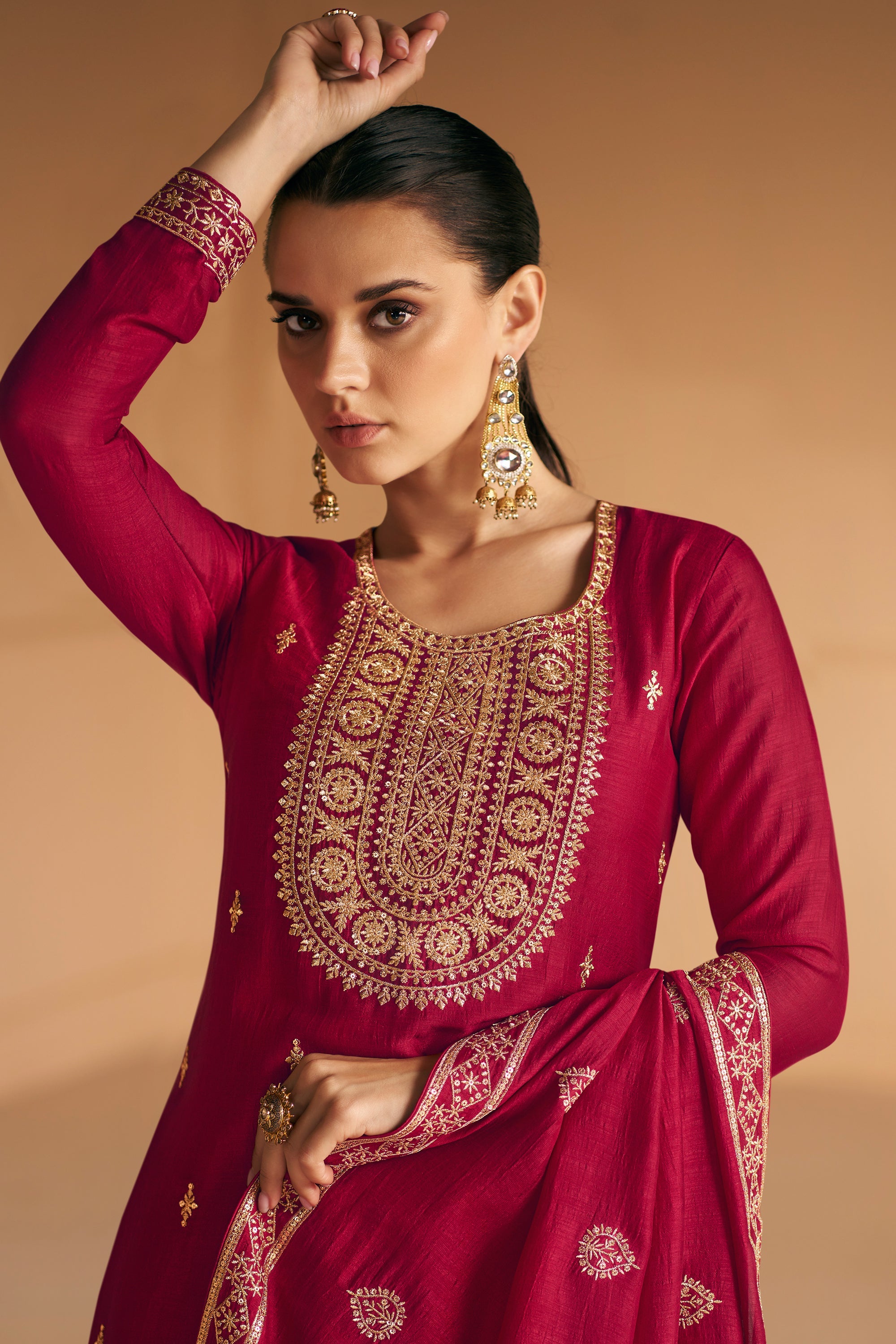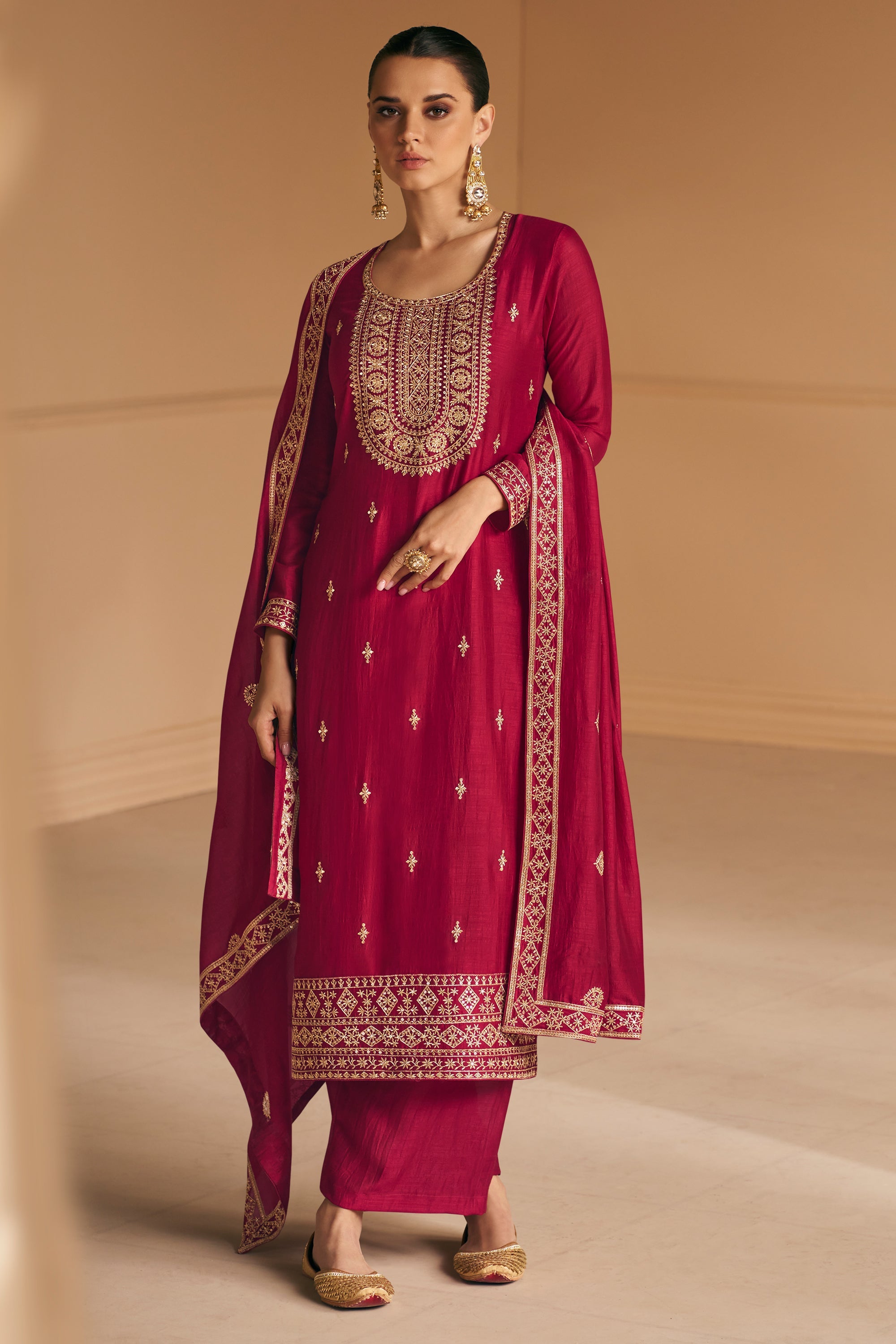 Embroidered Art Silk Fabric Rani Color Festive Wear Straight Cut Palazzo Salwar Kameez