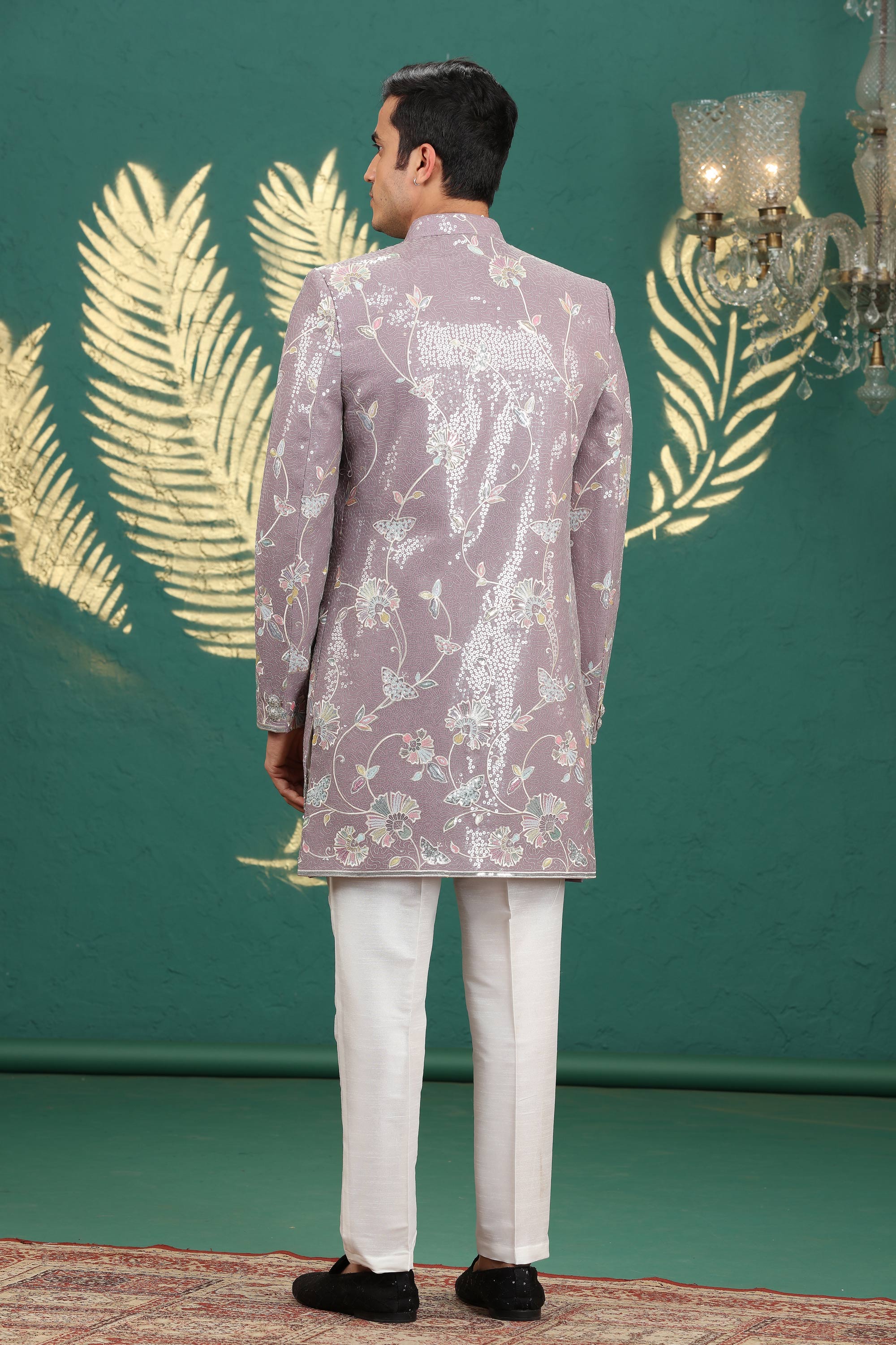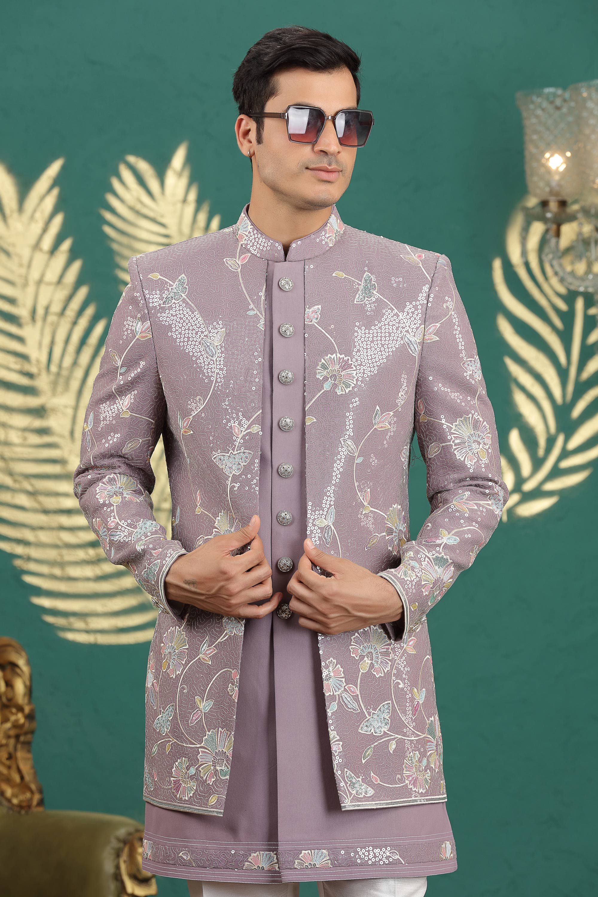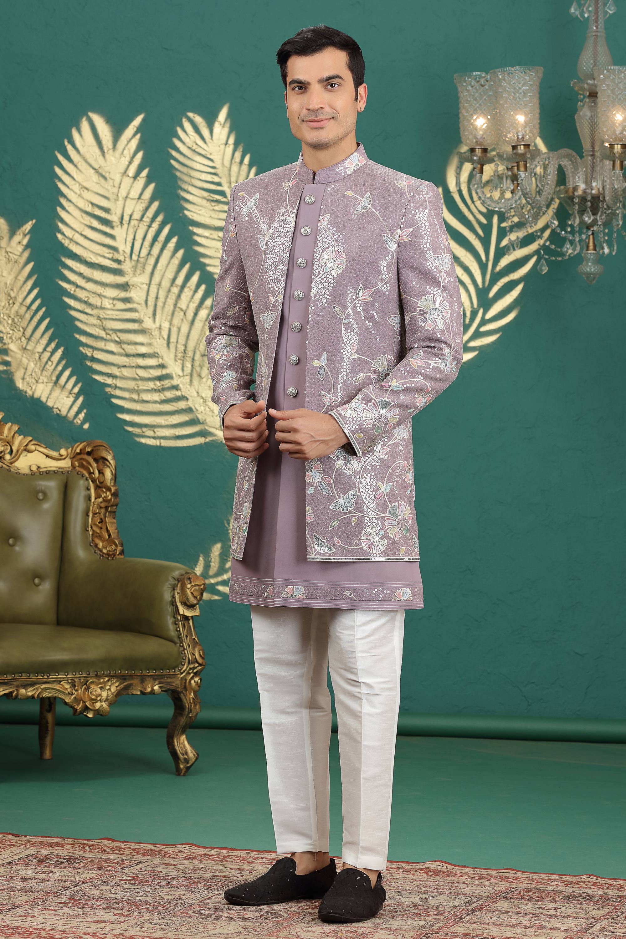Embroidered Art Silk Lavender Wedding Wear 3 Piece Indo Western For Men