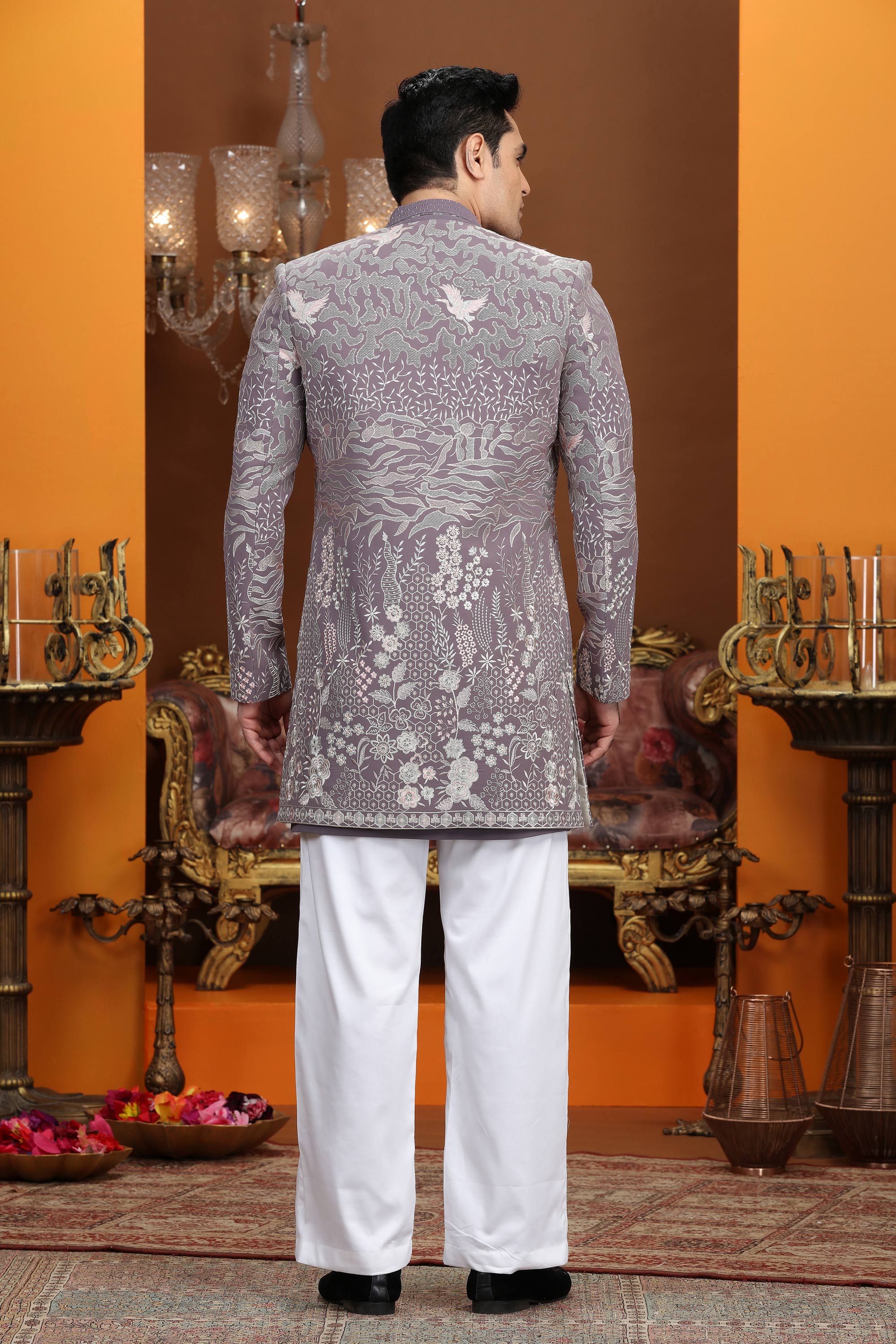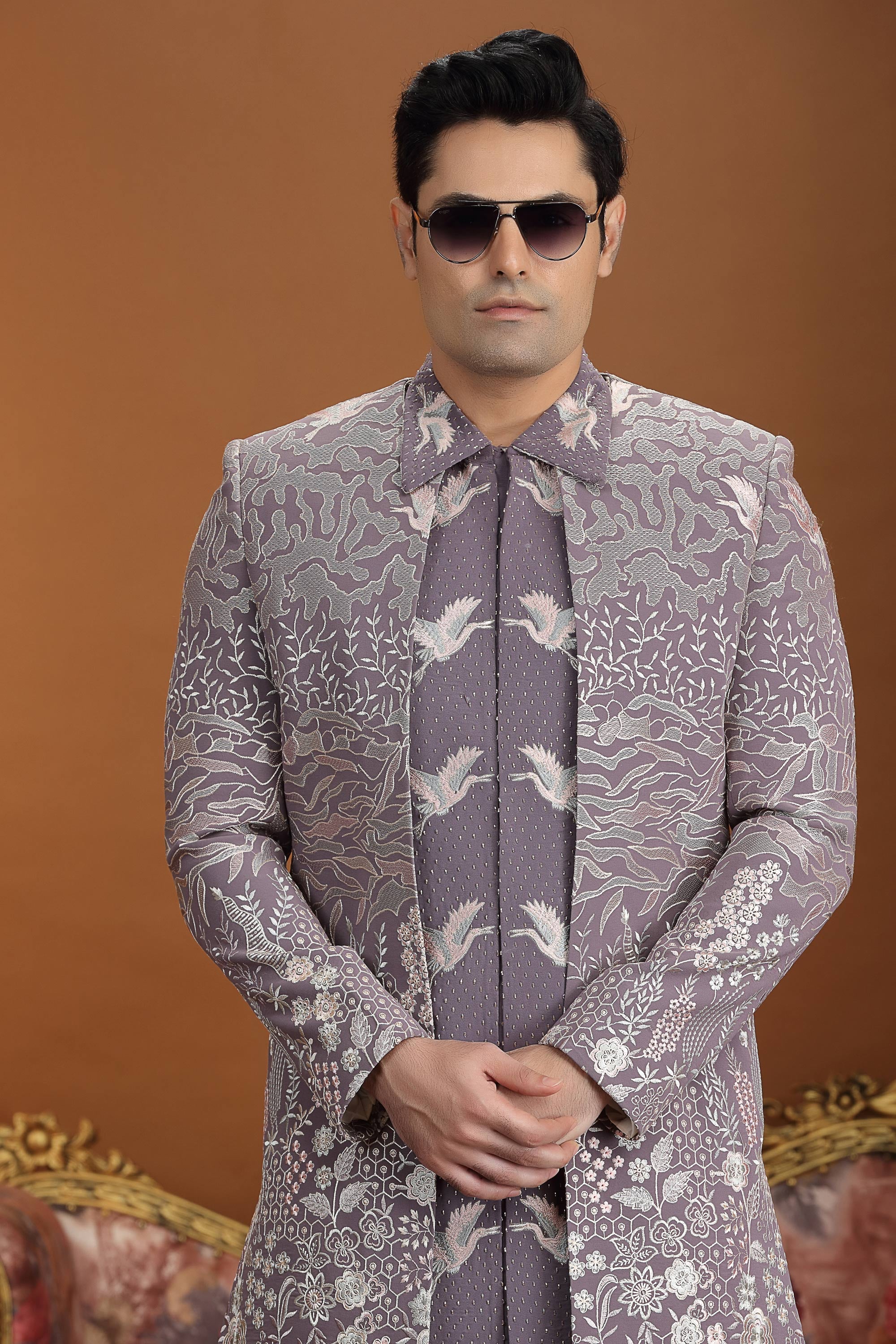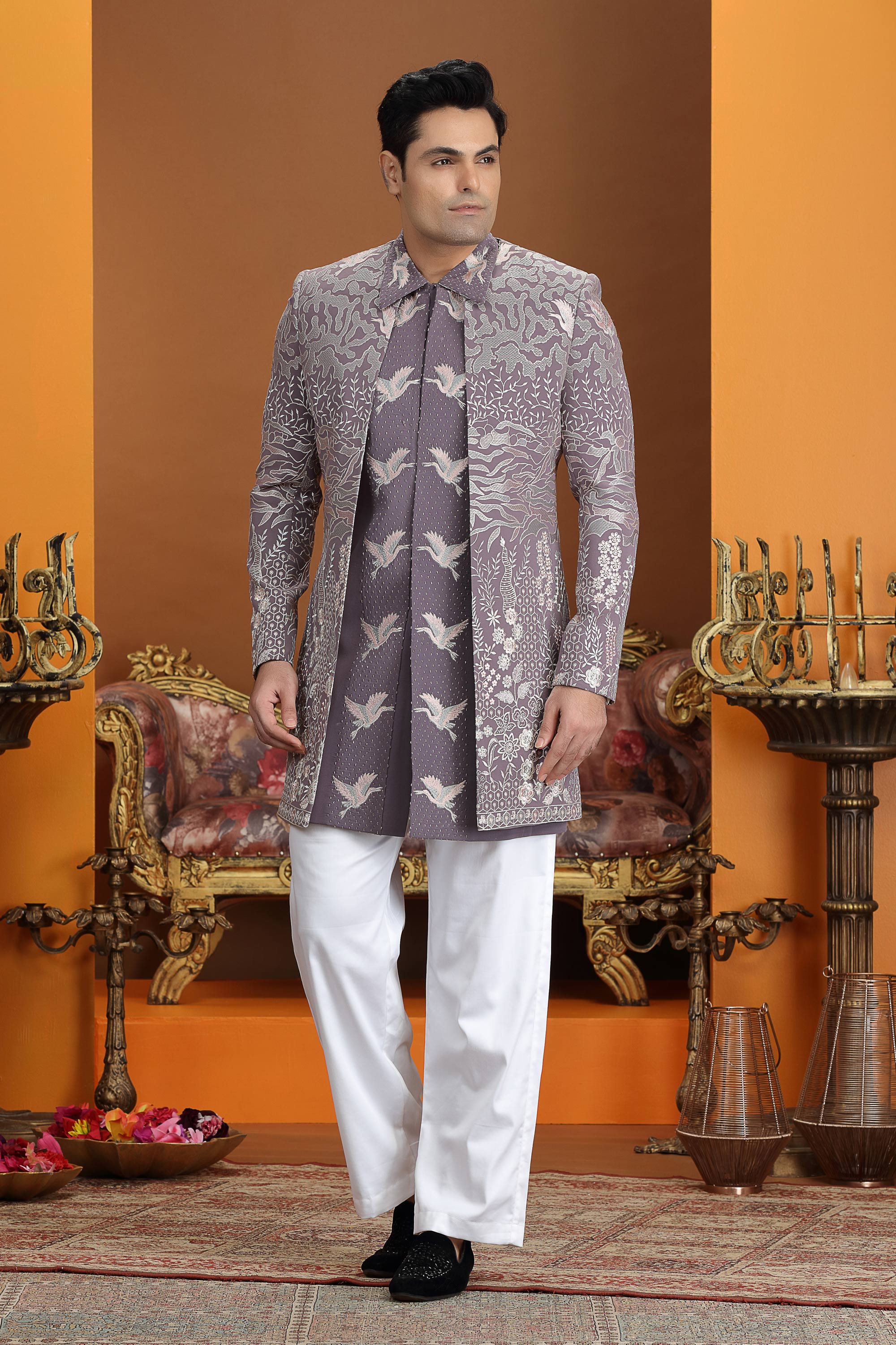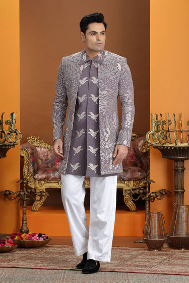 Embroidered Art Silk Purple 3 Piece Indo Western For Men