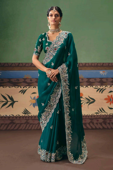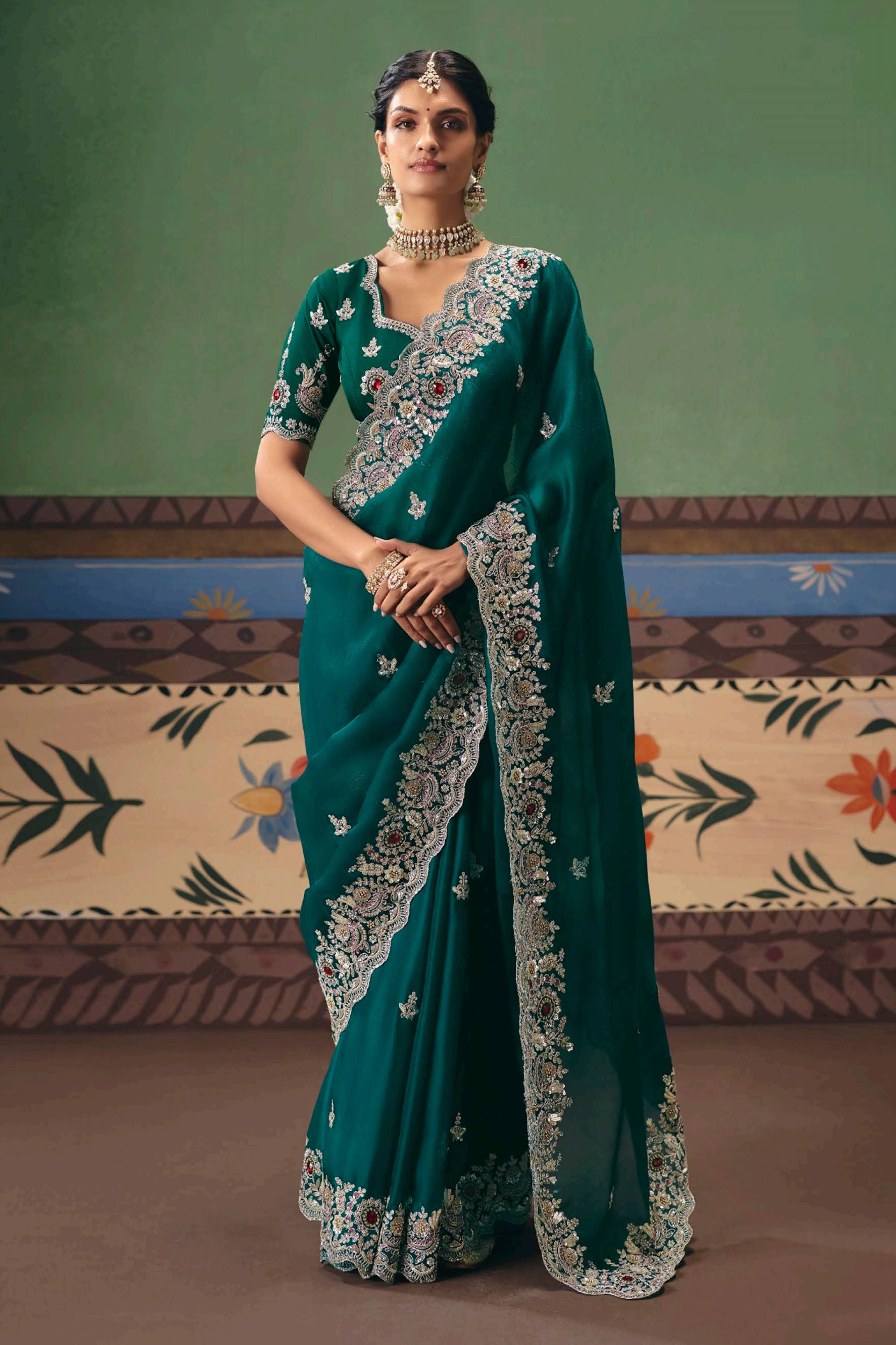 Embroidered Border Work Art Silk Teal Function Wear Designer Saree