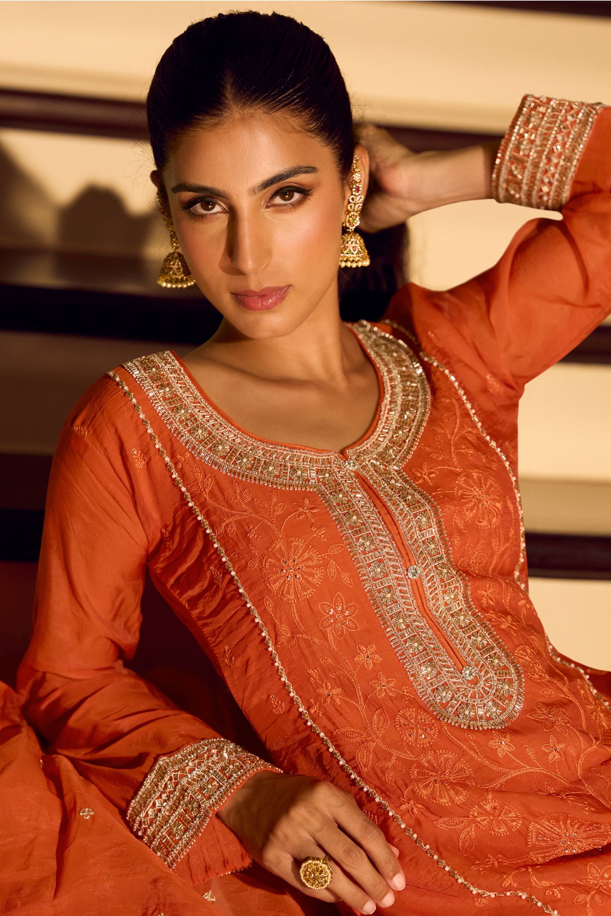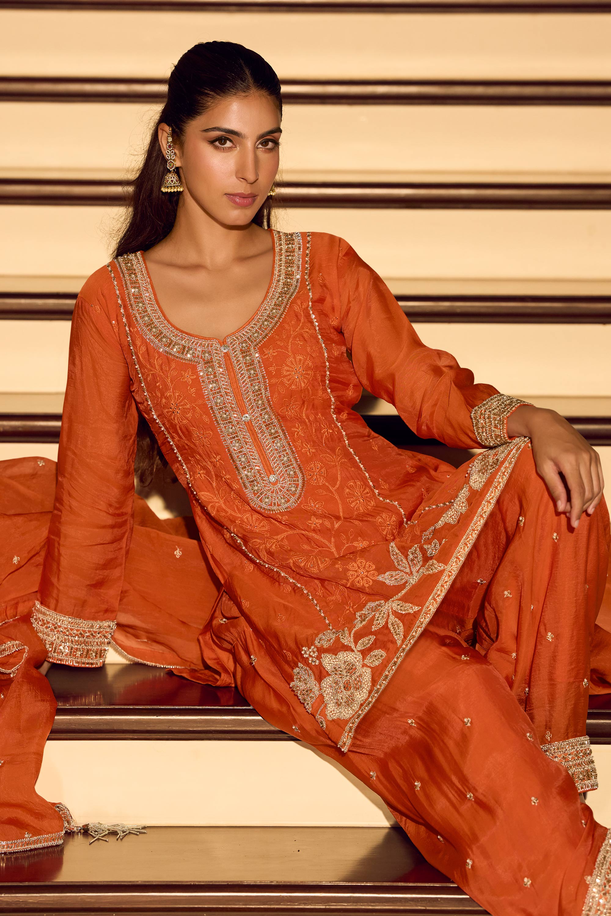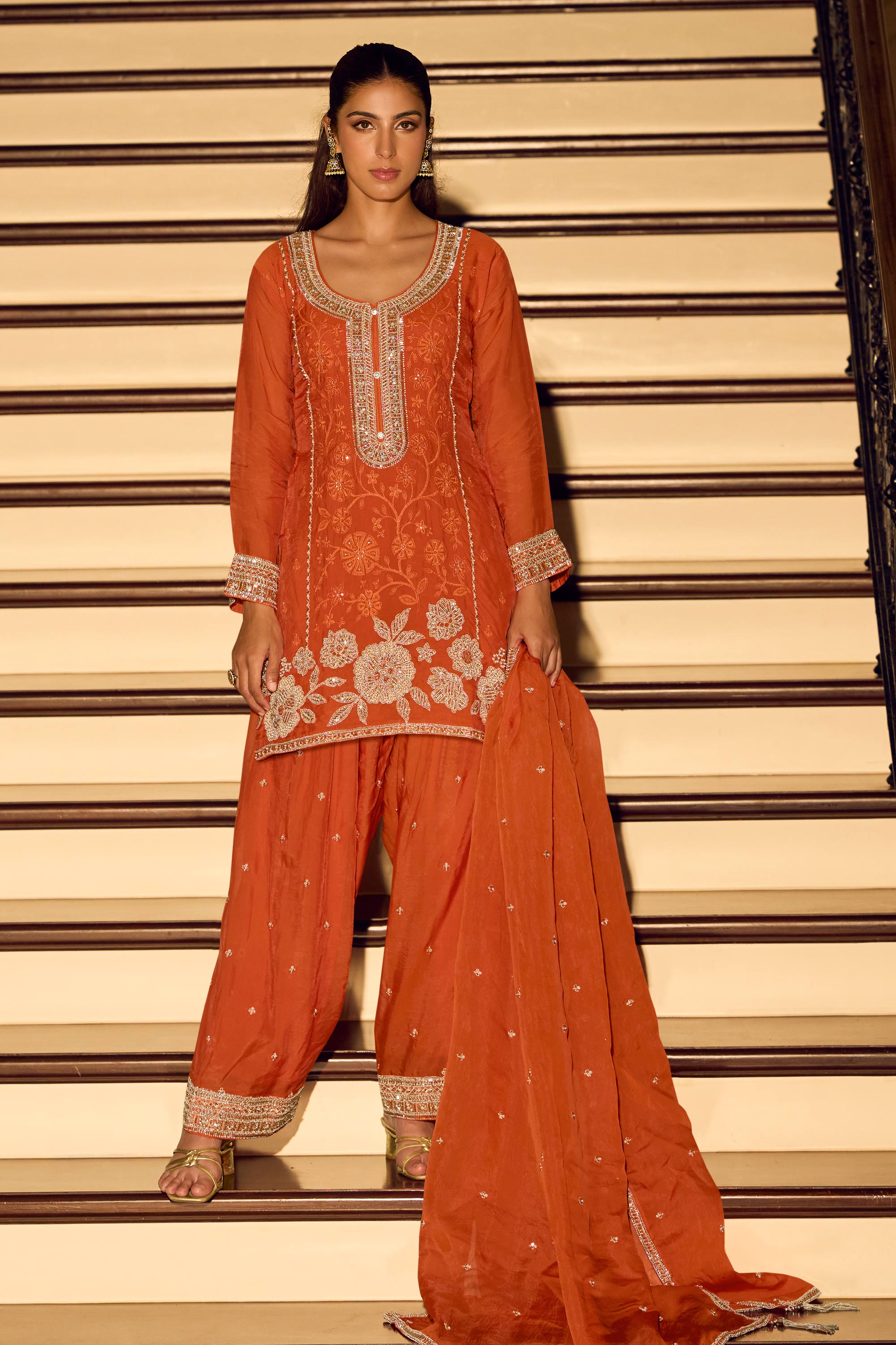 Embroidered Chinon Silk Rust Sangeet Wear Readymade Palazzo Suit