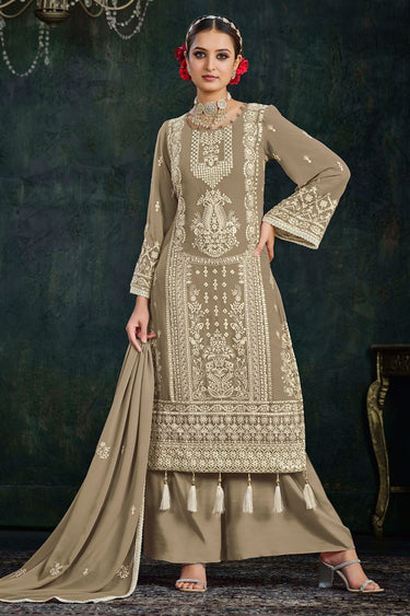 Embroidered Embellished Palazzo Suit In Dark Beige Color
