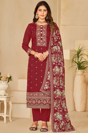 Exude your ethnic charm with this Straight Cut Salwar Suit designed in fine Art Silk Fabric. The suit features beautiful and intricate embroidery, ideal for enhancing your festive wear collection. This elegantly embroidered suit offers the perfect blend of comfort and style. Add a dash of traditional sophistication to your look with this ensemble.