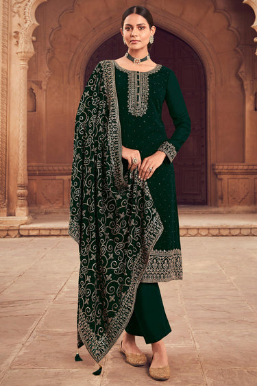 Embroidered Festive Wear Palazzo Salwar Kameez In Georgette Fabric Dark Green Color