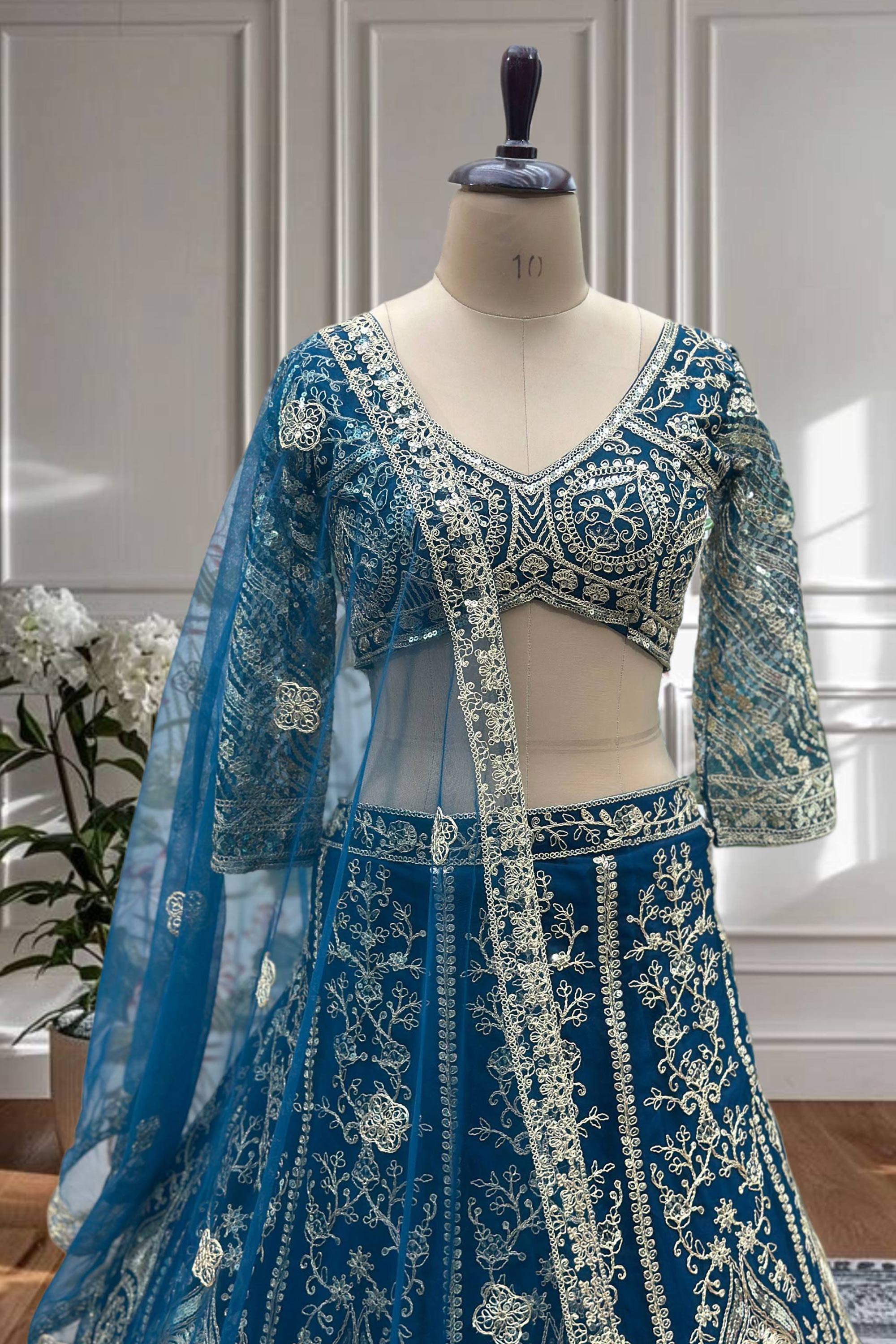 Embroidered Function Wear Net Lehenga Choli In Blue Color