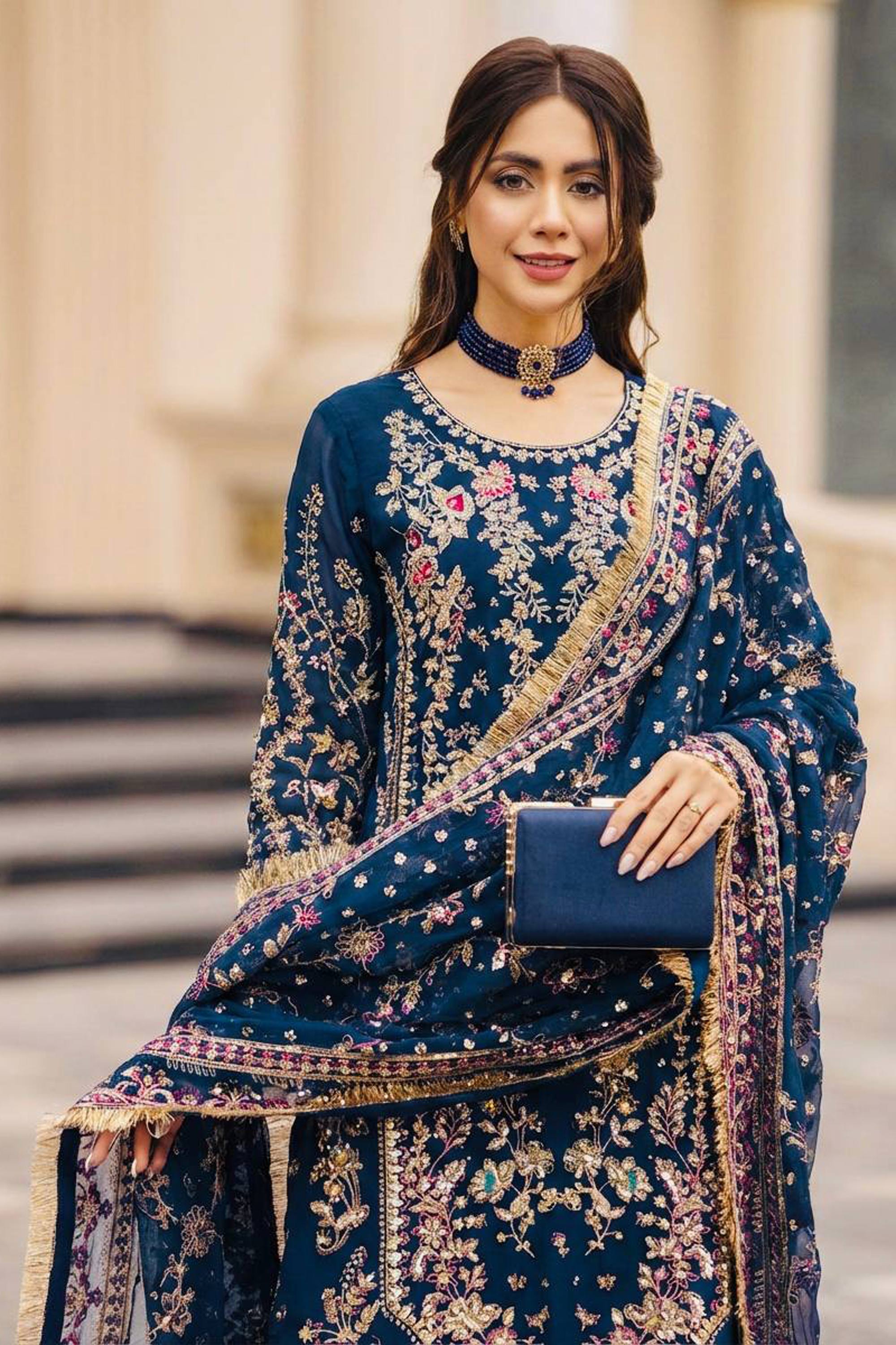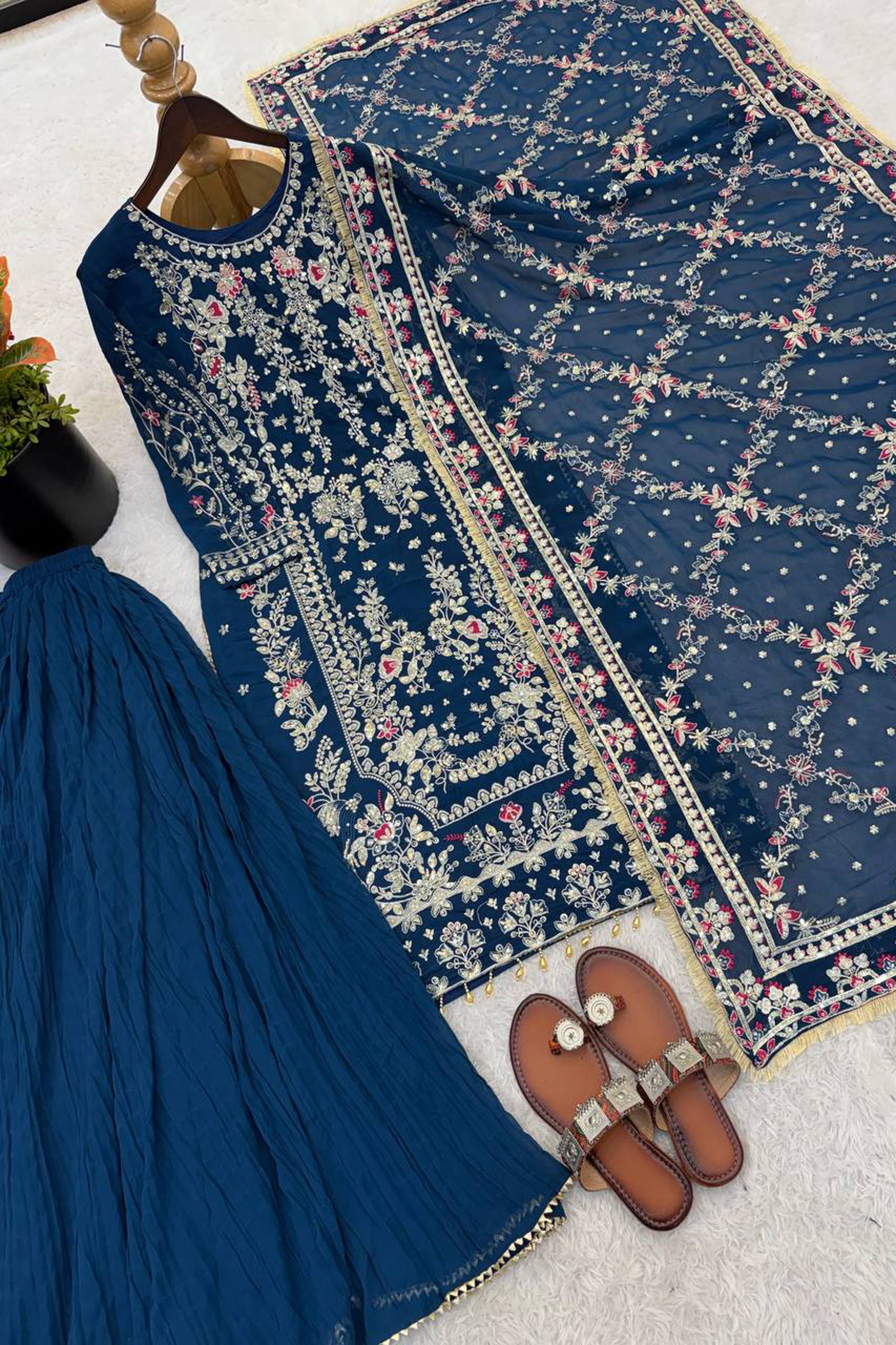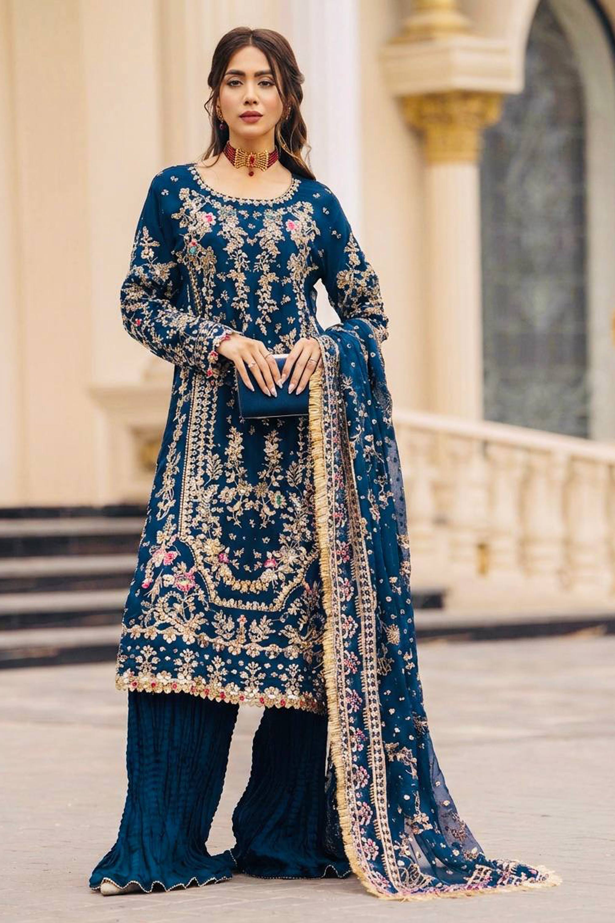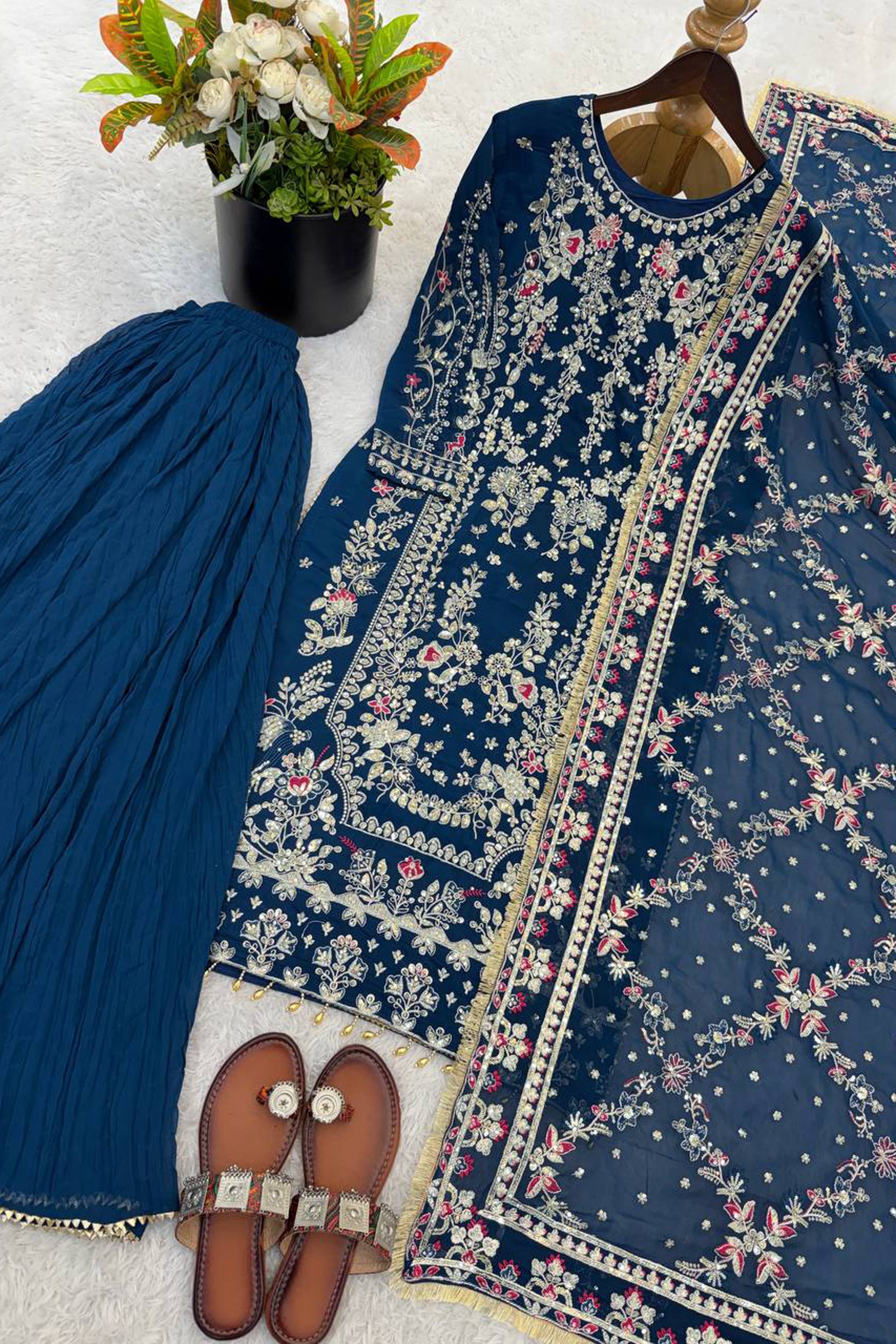 Embroidered Georgette Blue Readymade Palazzo Suit For Sangeet Wear