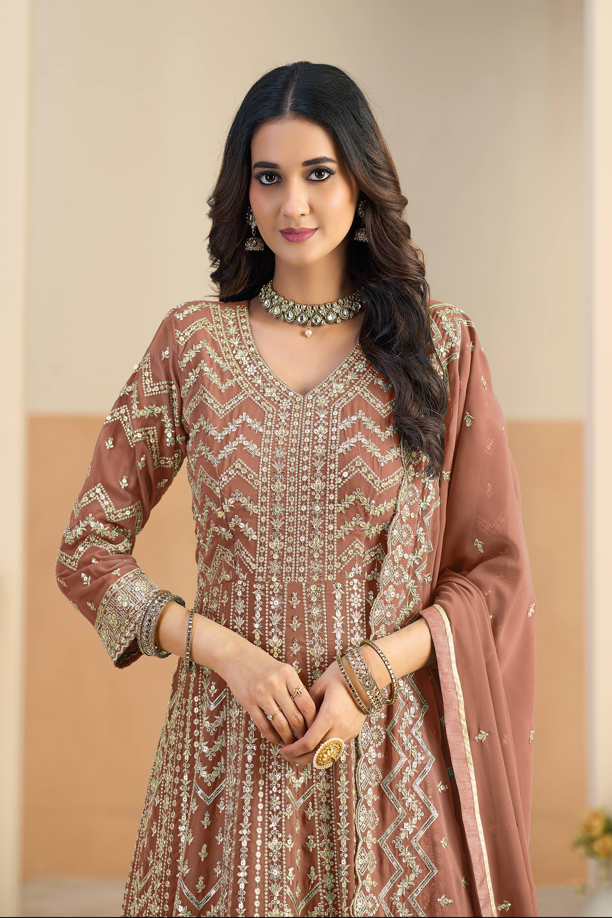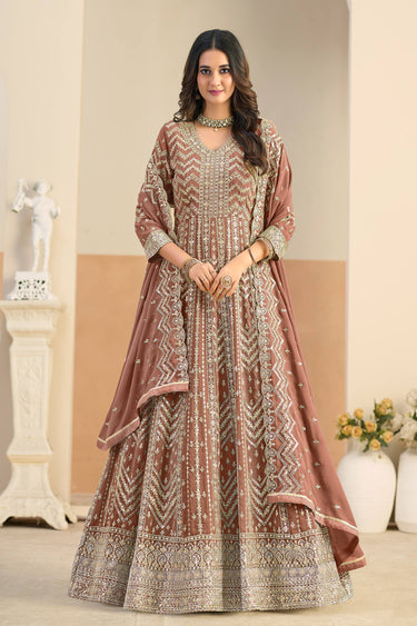 Embroidered Georgette Rust Readymade Anarkali Suit For Festive Wear