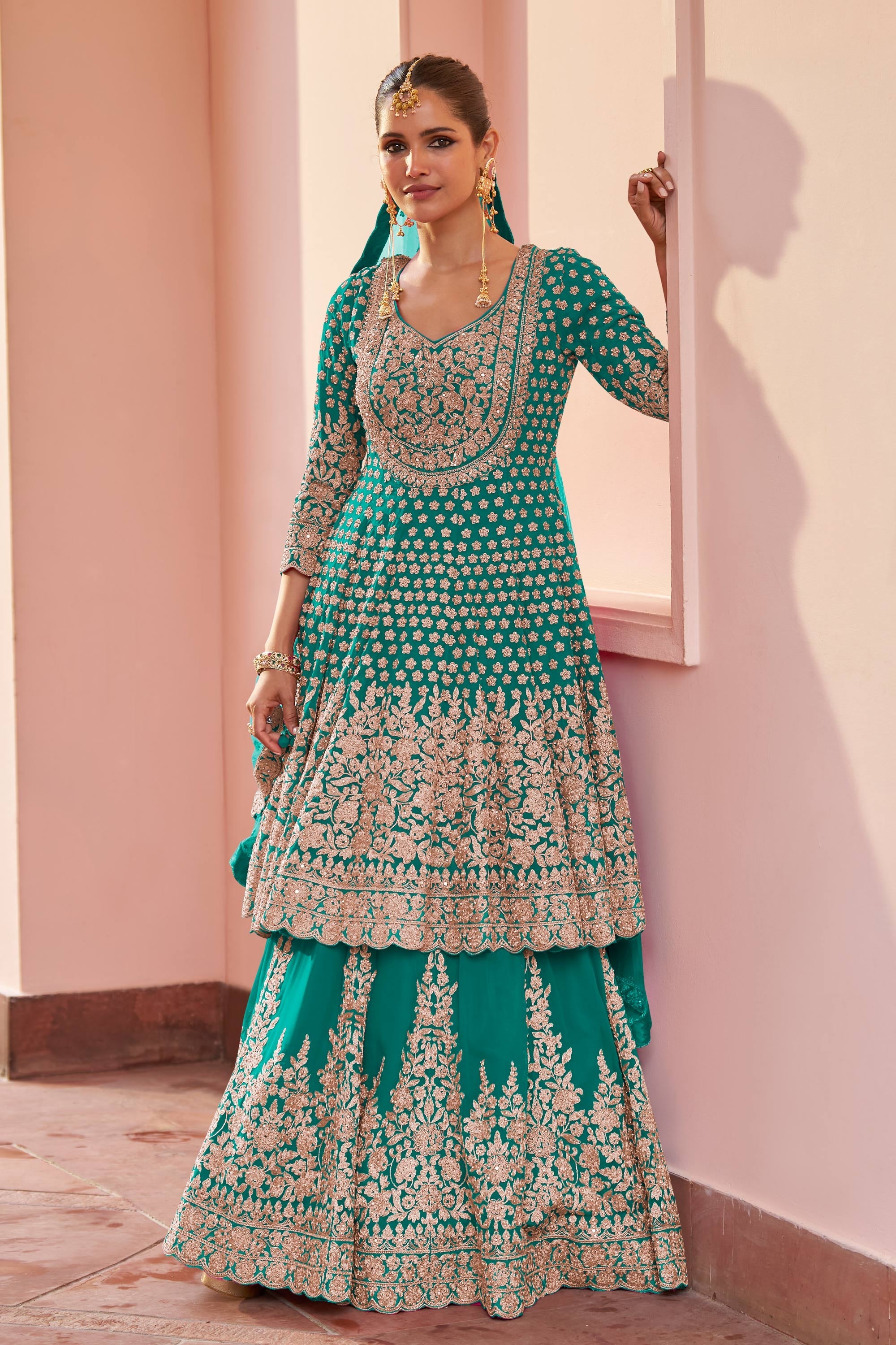 Embroidered Georgette Teal Wedding Wear Readymade Sharara Top Lehenga