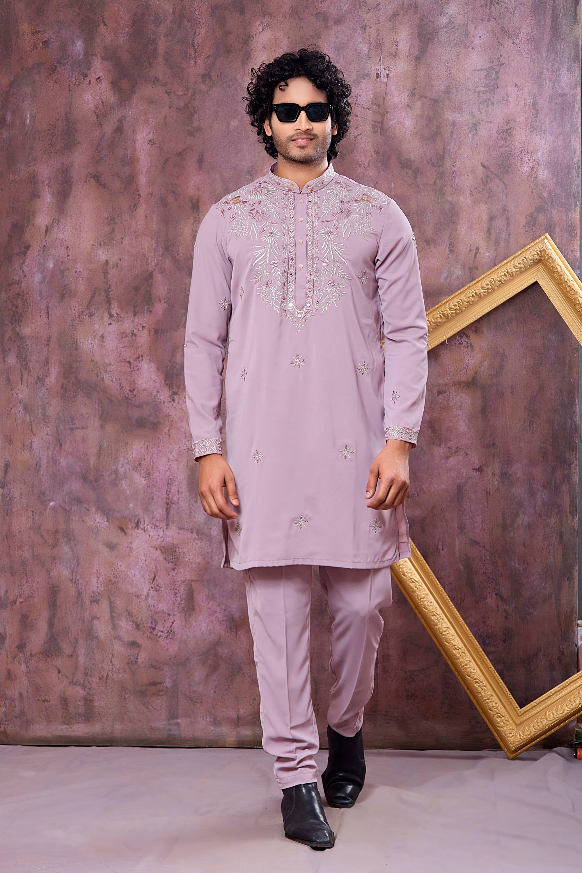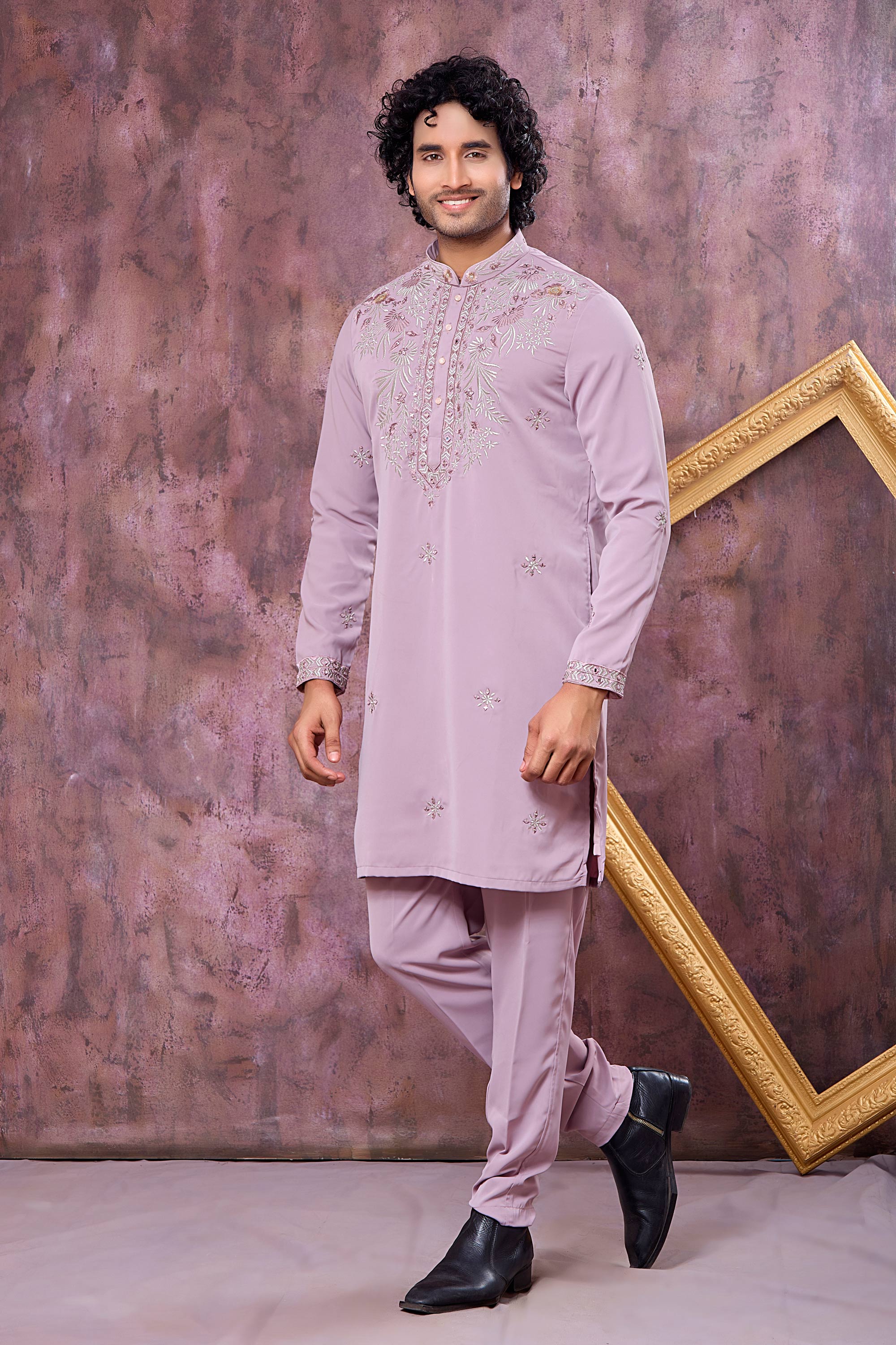 Embroidered Lavender Wedding Wear Readymade Kurta With Aligadhi Pant For Men