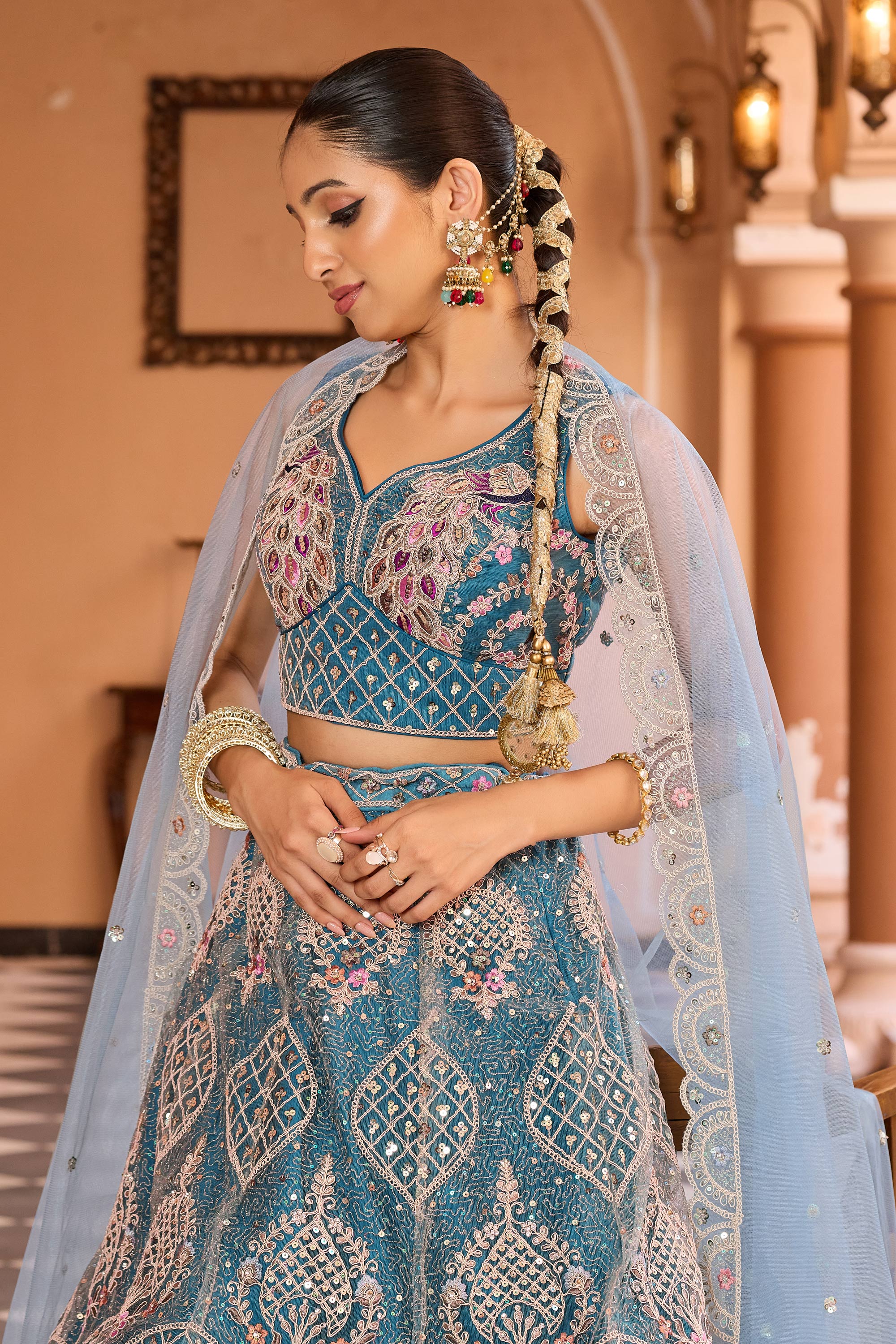 Embroidered Net Teal Wedding Wear Lehenga Choli With Dupatta