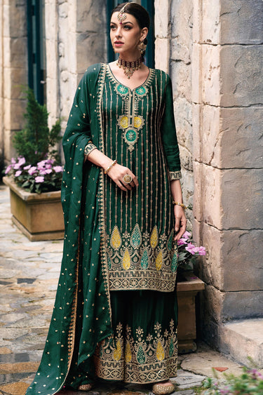 Embroidered Palazzo Salwar Kameez In Chinon Fabric Dark Green Color