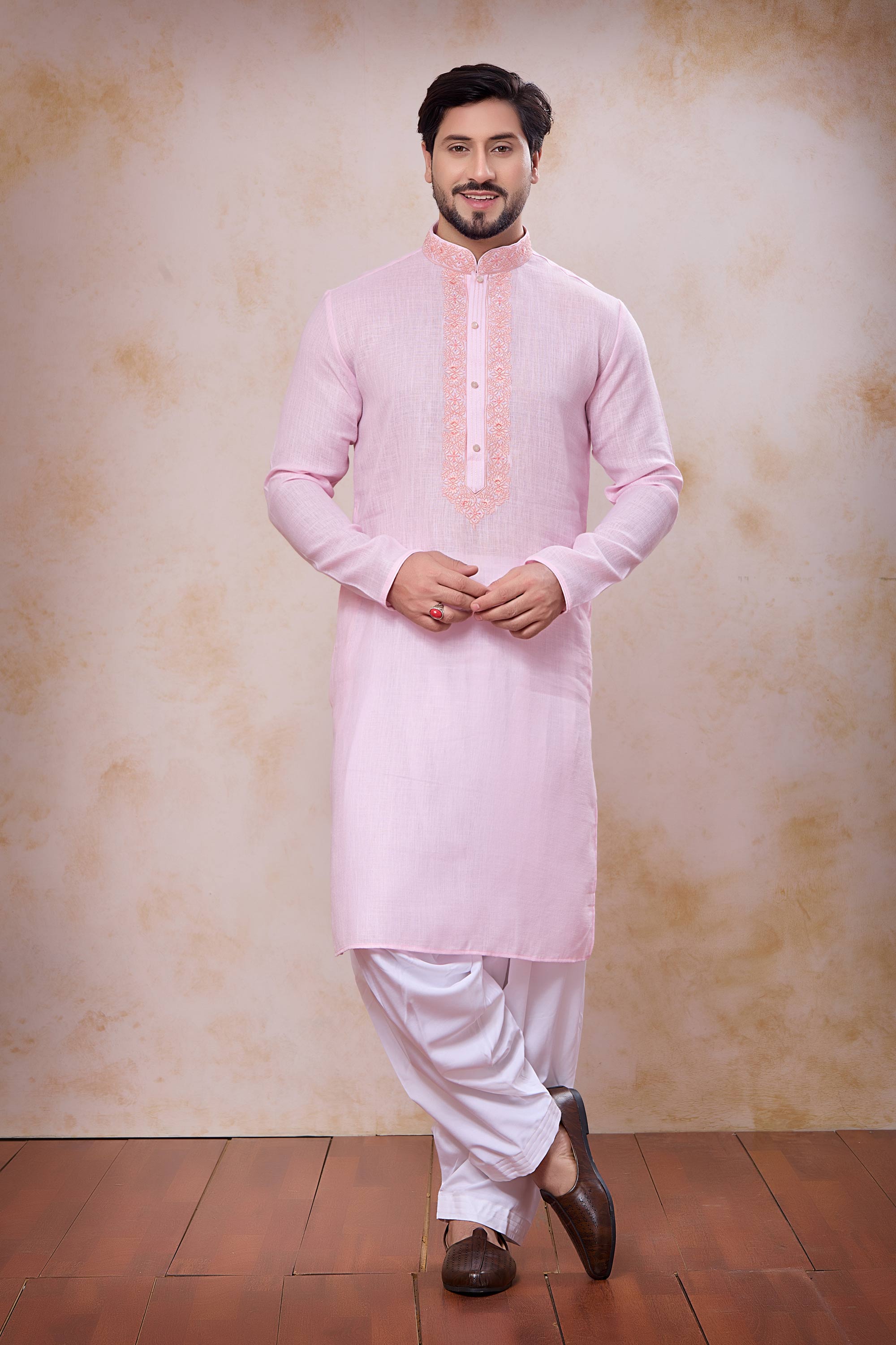 Embroidered Pink Sangeet Wear Readymade Kurta With Patiyala Style Bottom For Men