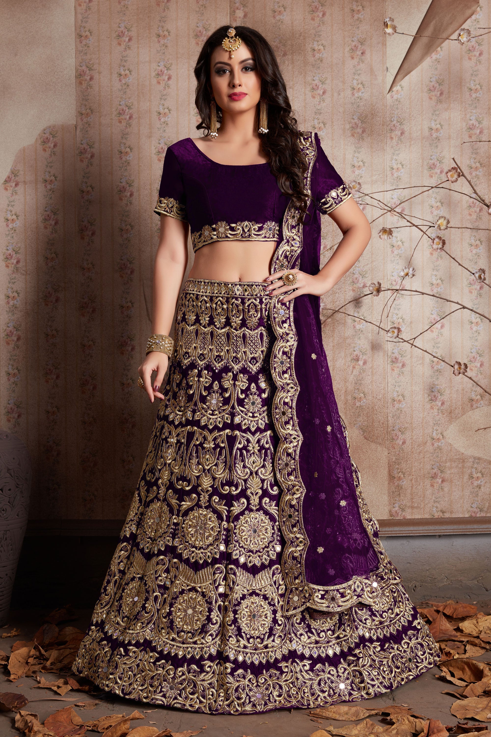 Embroidered Purple Velvet Sangeet Wear Lehenga Choli