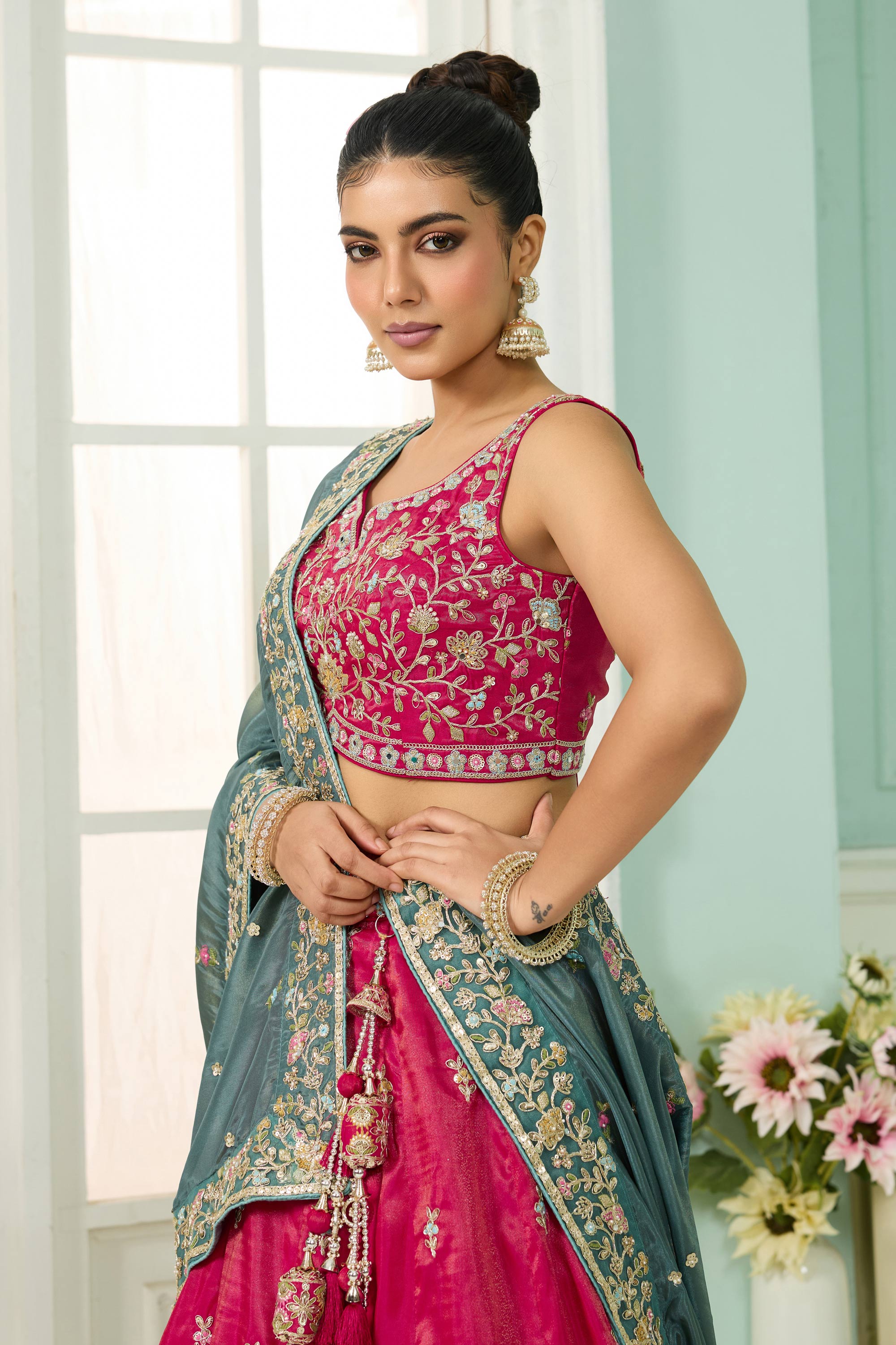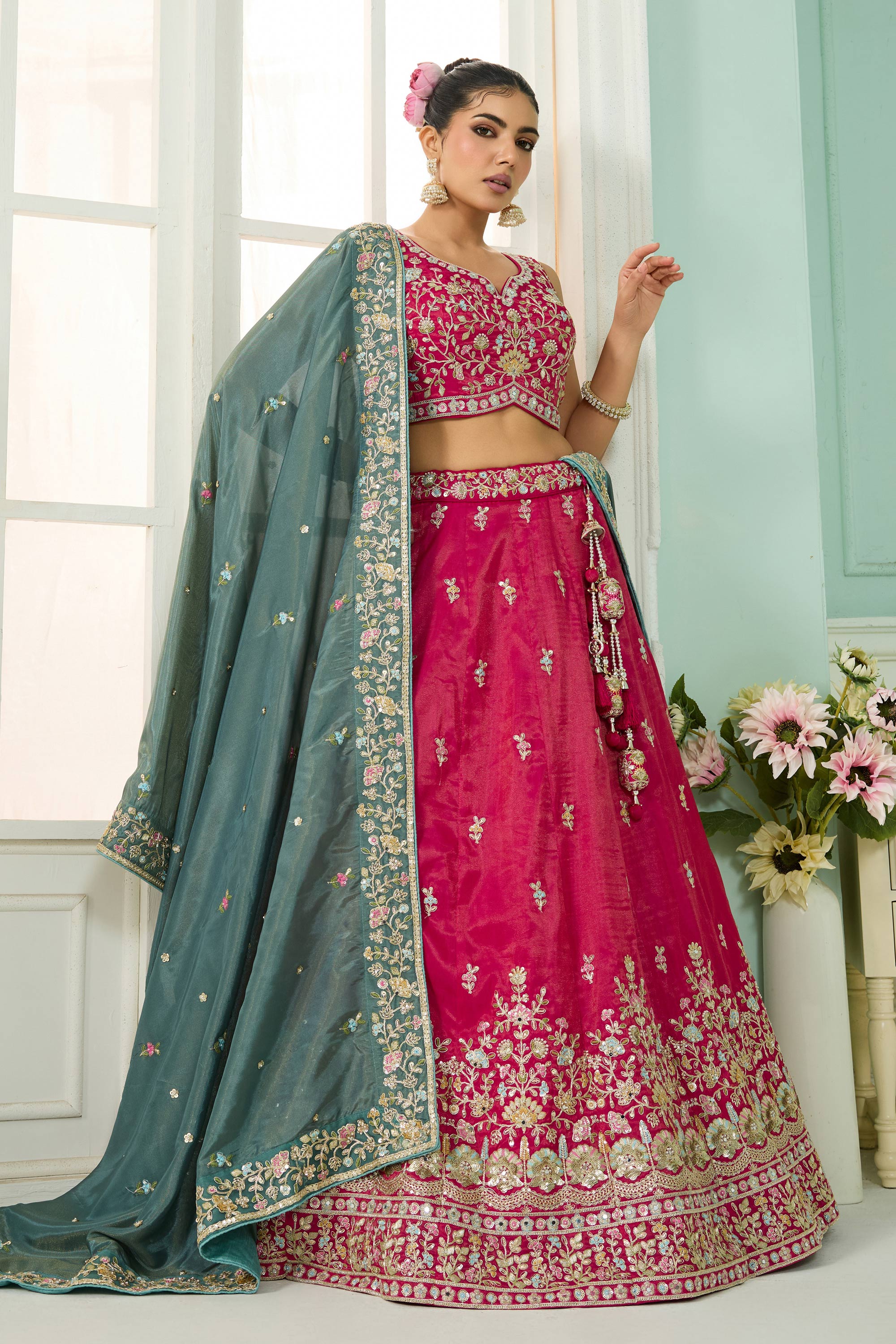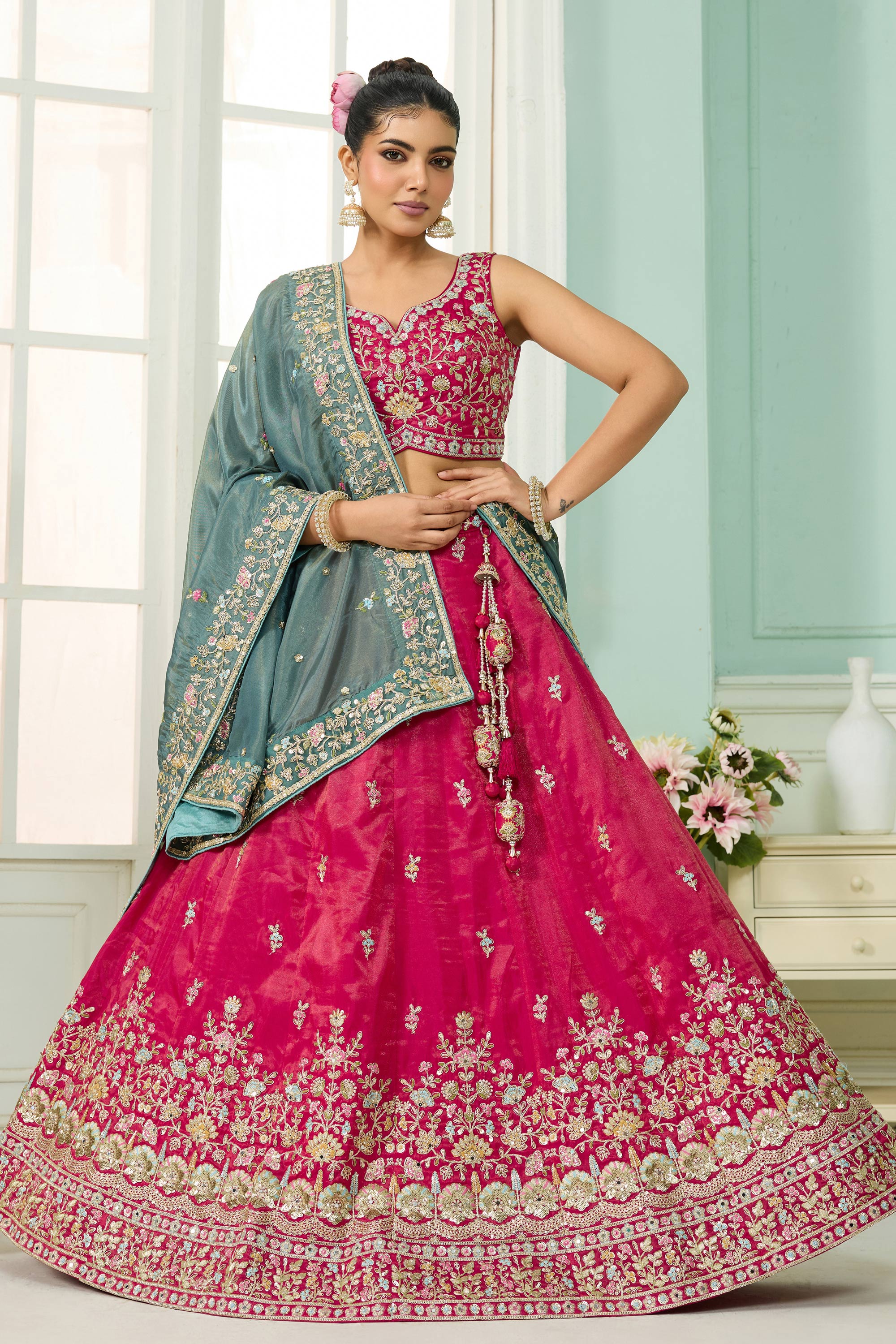 Turn heads at any wedding function with this Reach Color Semi-Stitched Lehenga, detailed with shimmering sequin embroidery. Paired with a three-quarter-sleeve blouse, this ensemble brings an air of elegance to any festive occasion. The drawstring feature provides added comfort, making it easy to tailor the fit to your preference. Perfect for weddings, engagement celebrations, or other special gatherings, this lehenga is a brilliant blend of comfort and glamour. Let its classic yet trendy design reflect your impeccable taste in style.