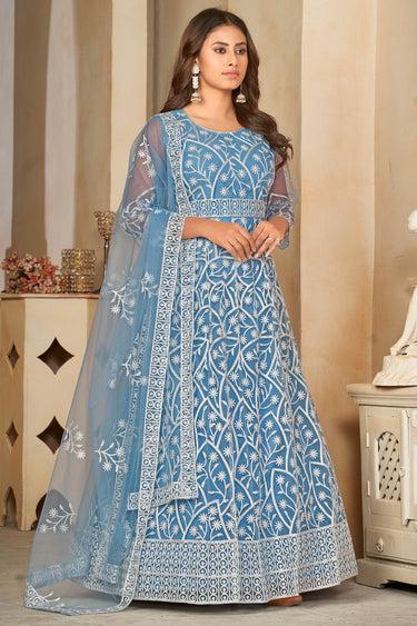 Embroidered Sky Blue Color Inventive Anarakali Suit In Net Fabric