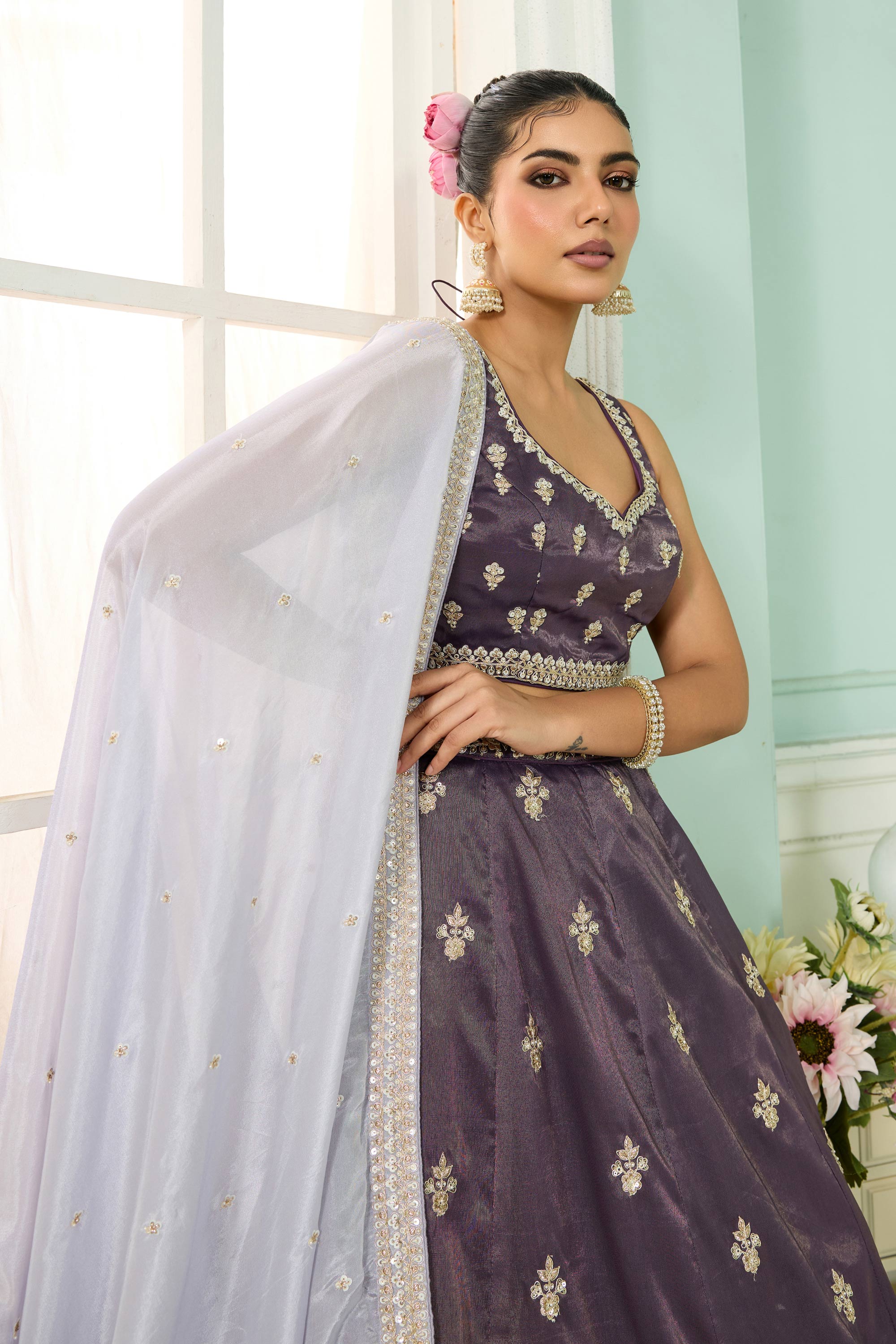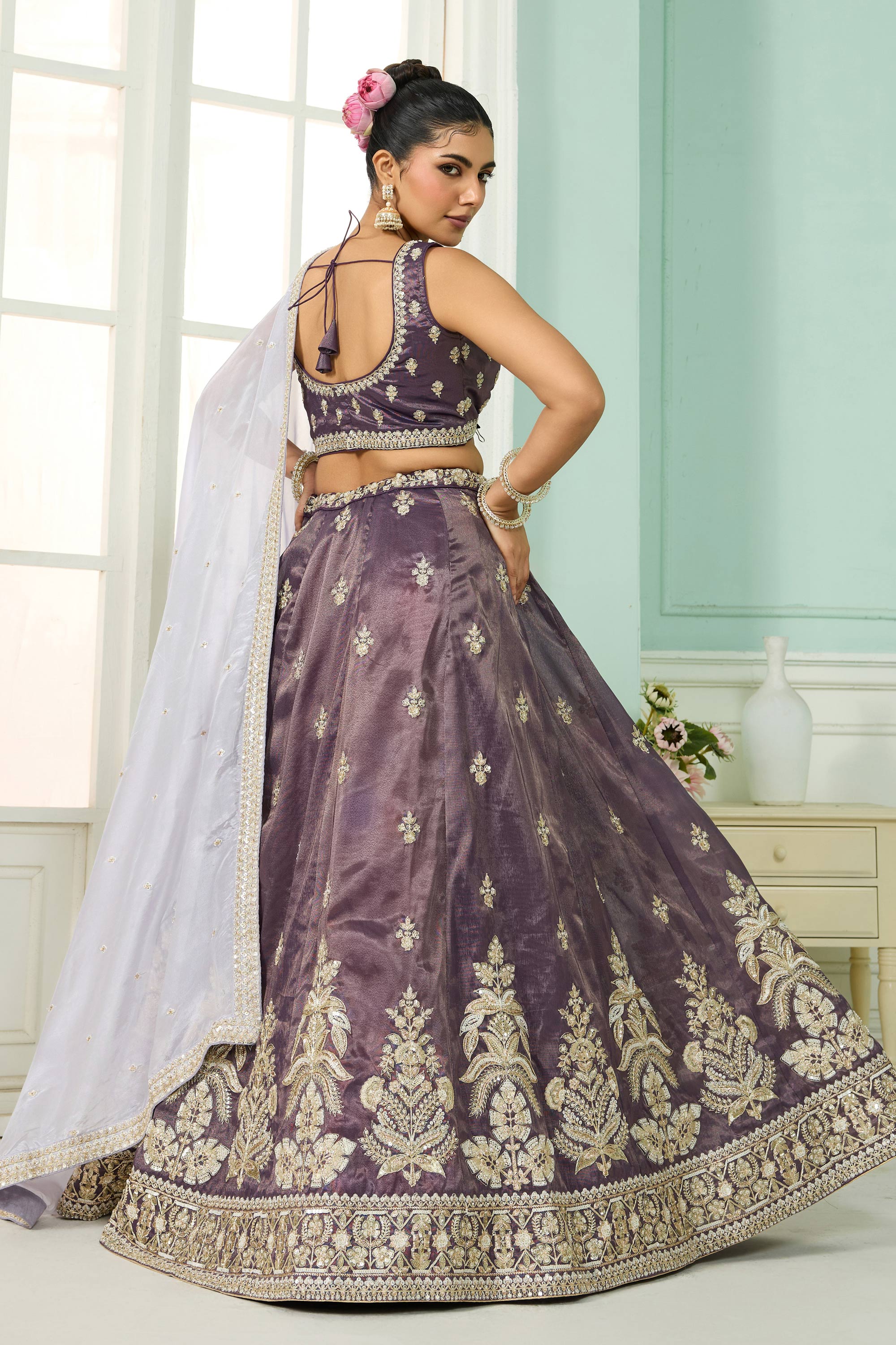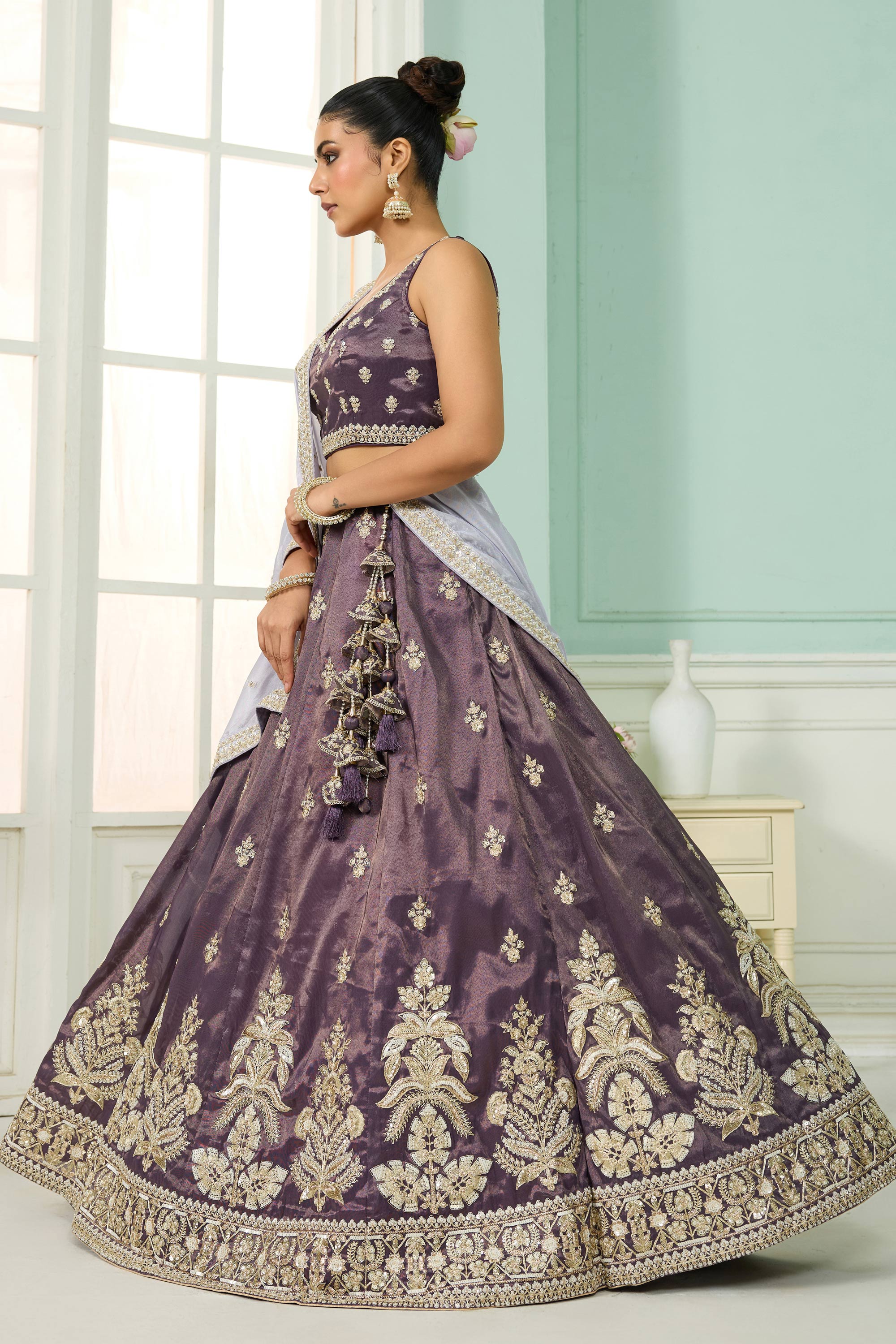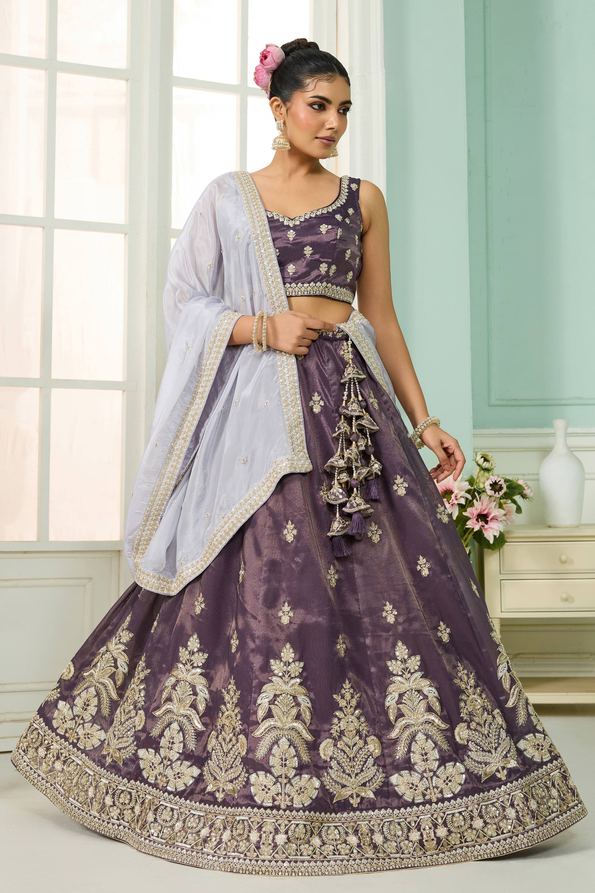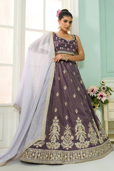 Embroidered Tissue Purple Wedding Wear Lehenga Choli With Dupatta