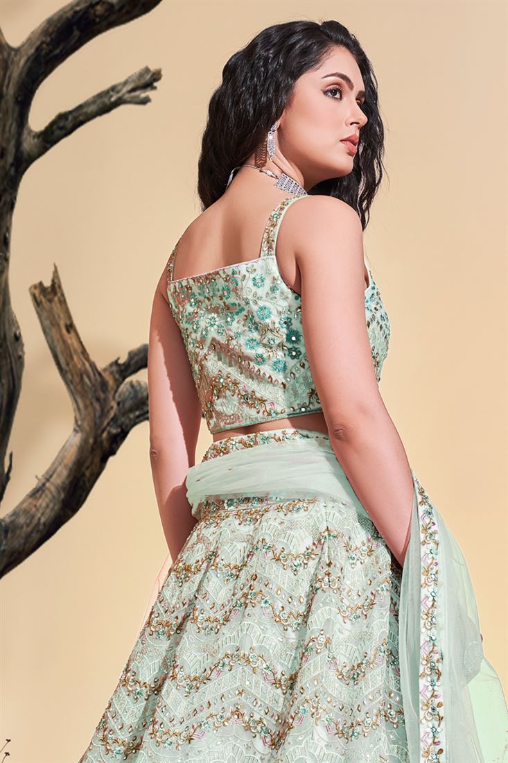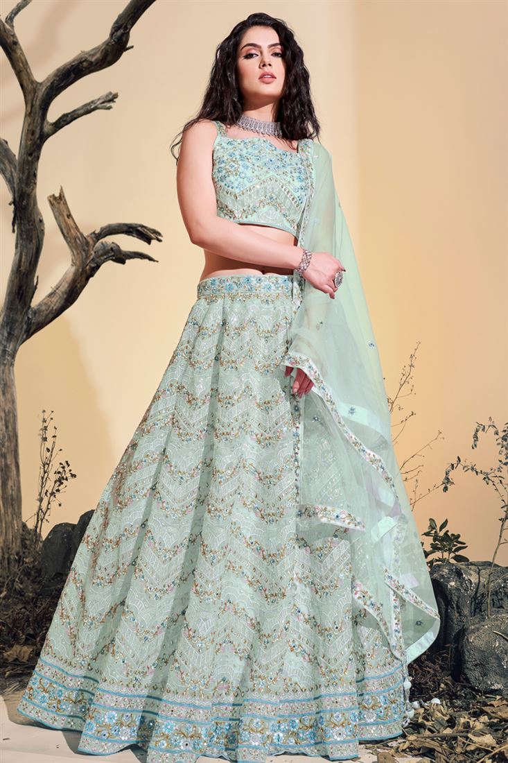 Make a lasting impression at your next function with our Designer Light Cyan Color Lehenga. Order now and experience the ultimate in luxury fashion.