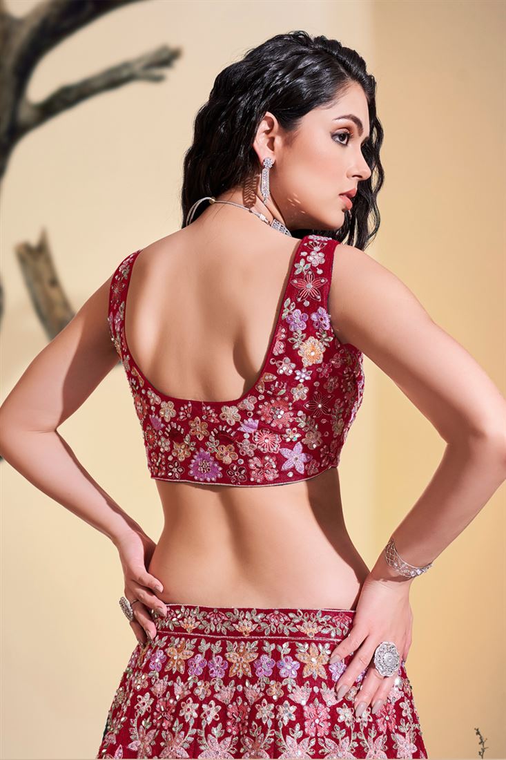Embroidered Work Captivating Net Fabric Readymade Lehenga In Rani Color