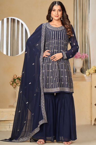 Embroidered Work Navy Blue Color Georgette Fabric Beauteous Palazzo Suit