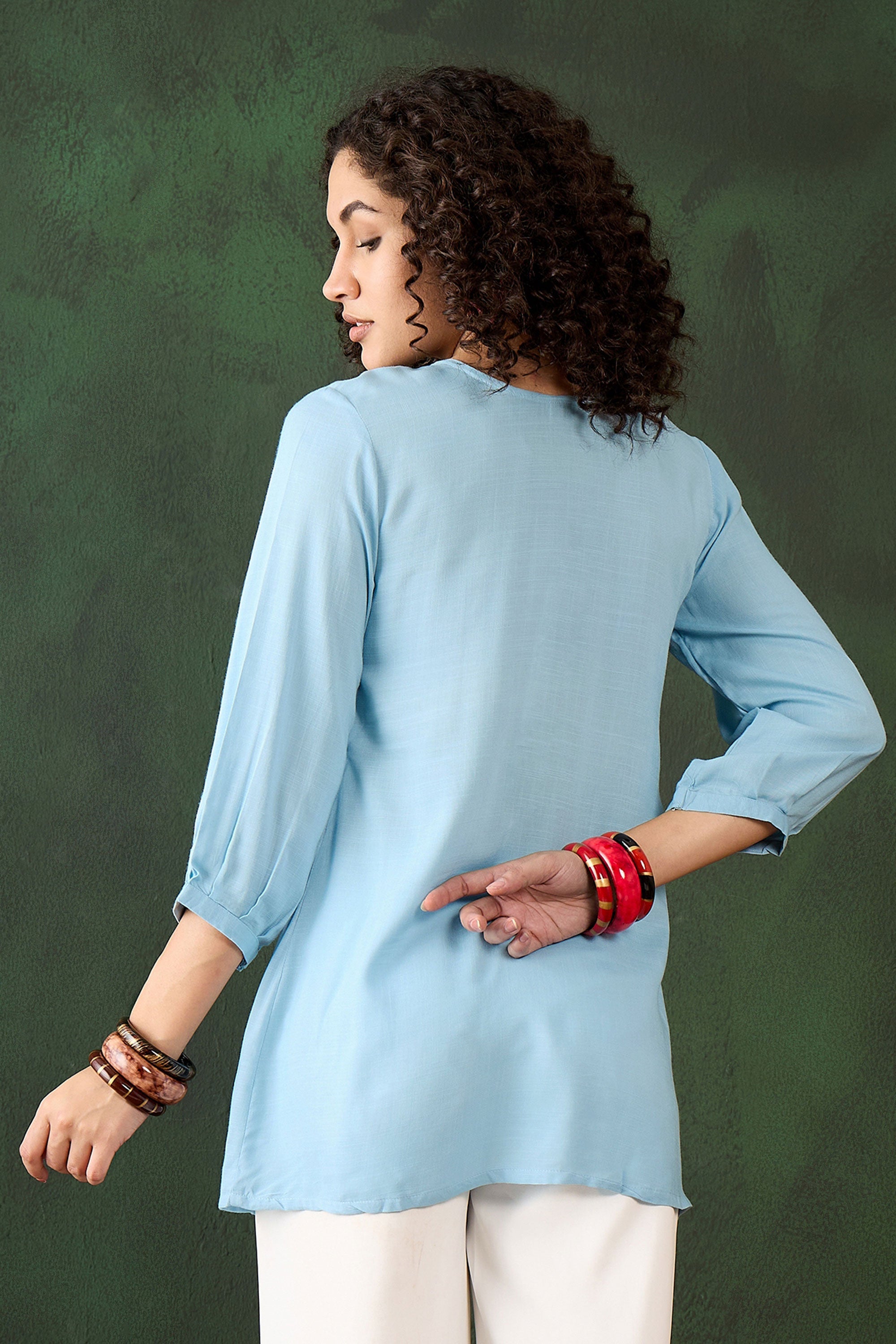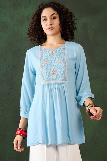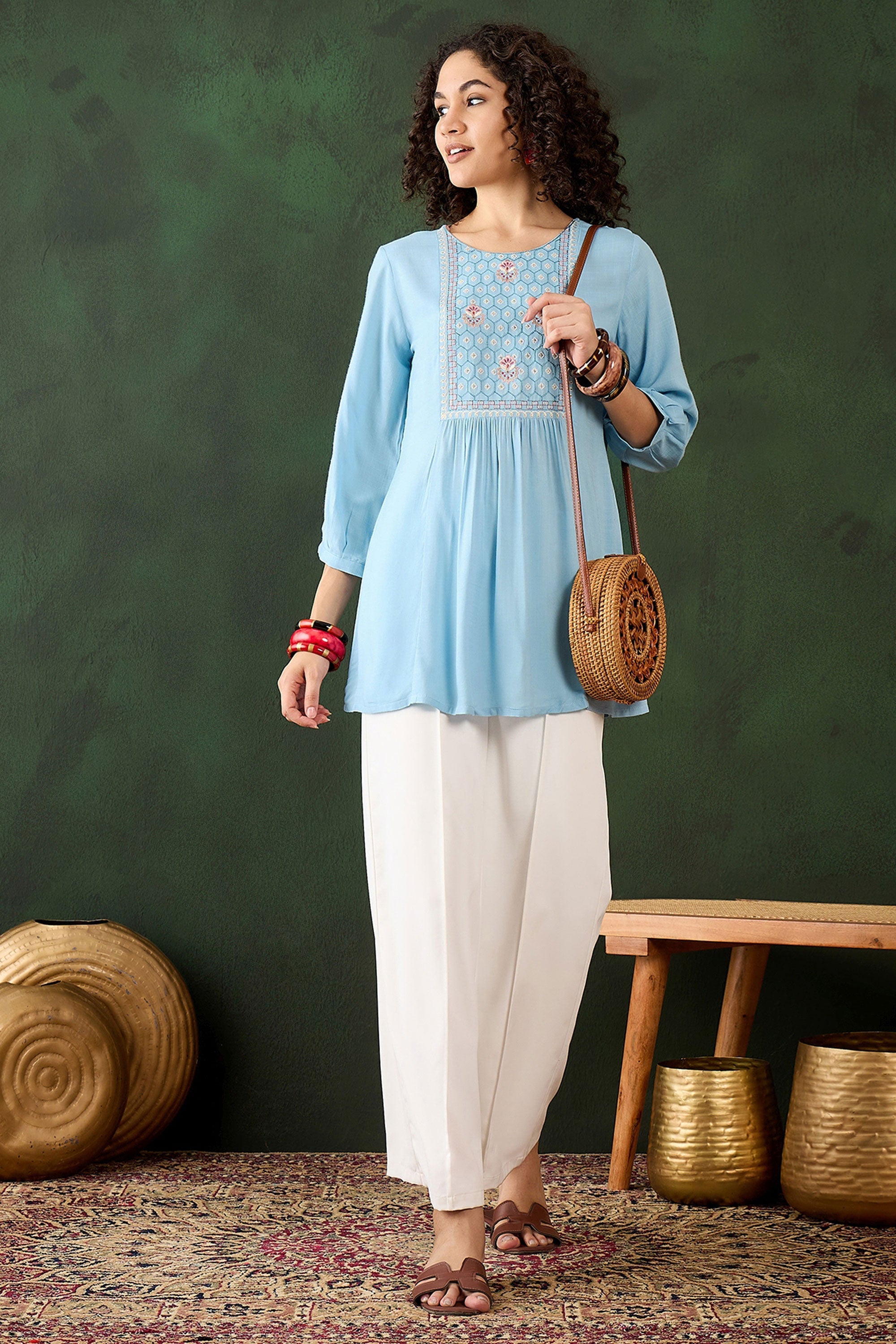Embroidered Work Sky Blue Color Rayon Fabric Beauteous Short Kurti