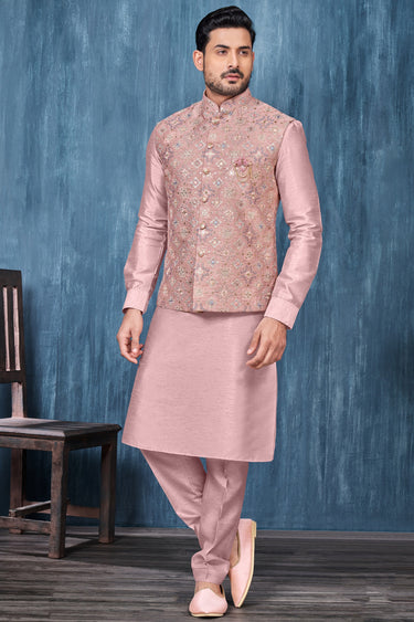 Embroidery Work Appealing Pink Color Banarasi Silk Fabric Function Wear Readymade Kurta Pyjama For Men With Jacket