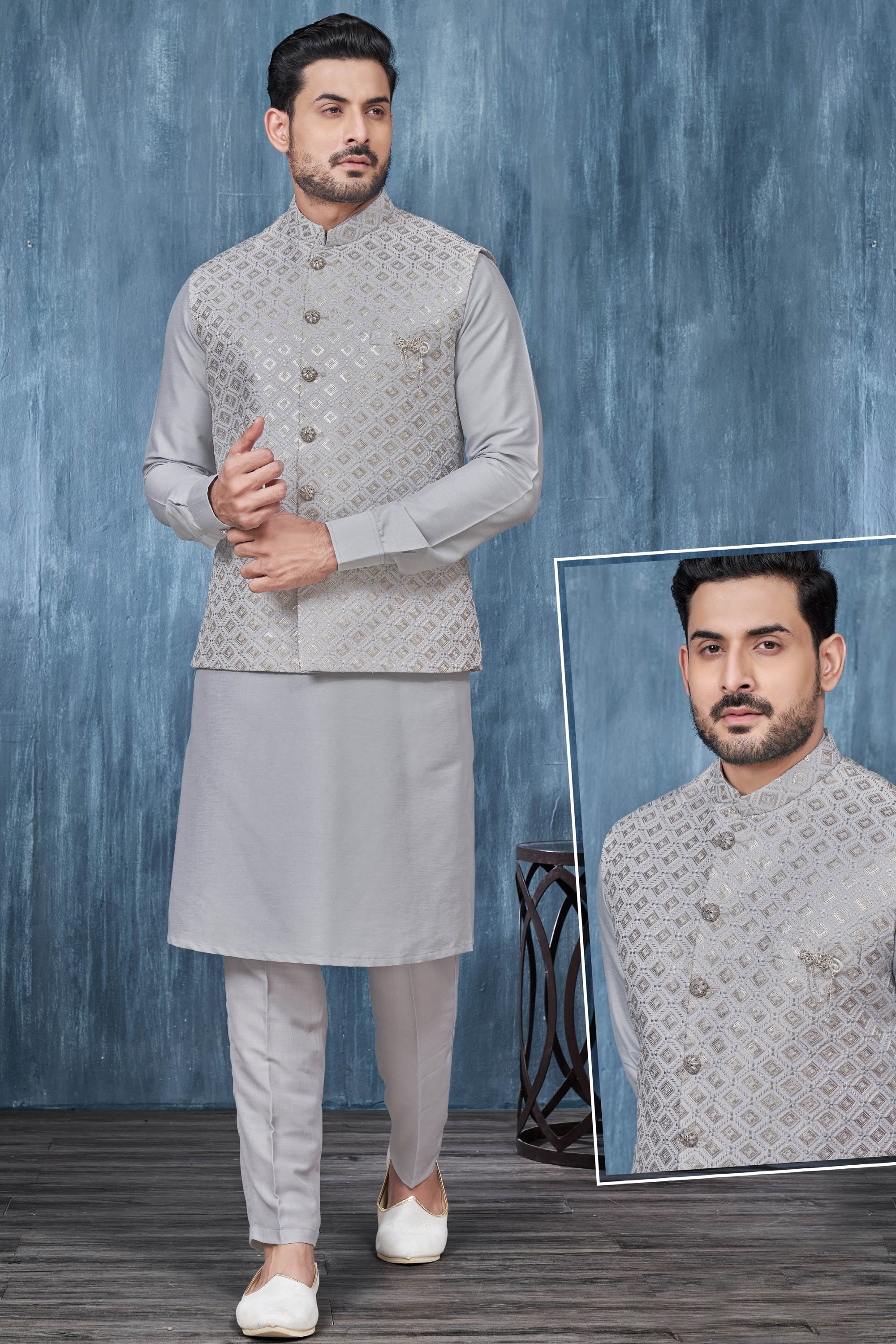 Embroidery Work Banarasi Silk Grey Color Sangeet Wear Readymade Kurta Pyjama For Men With Jacket