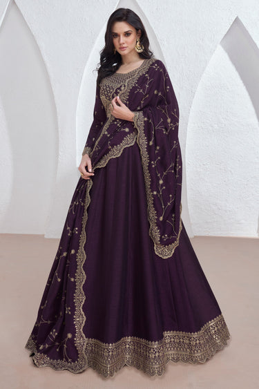 Embroidery Work Purple Color Party Wear Silk Readymade Anarkali Gown With Dupatta