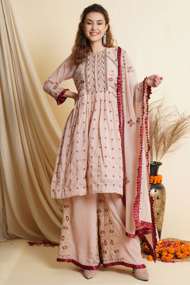 Embroidery Work Sharara Style Palazzo Salwar Suit In Pink Color