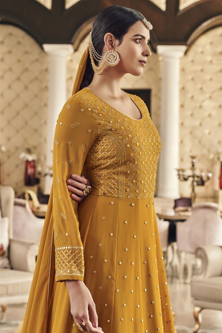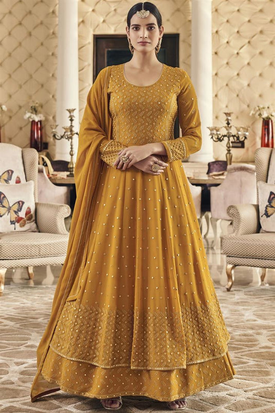 Engaging Georgette Fabric Mustard Color Embroidered Work Anarkali Suit