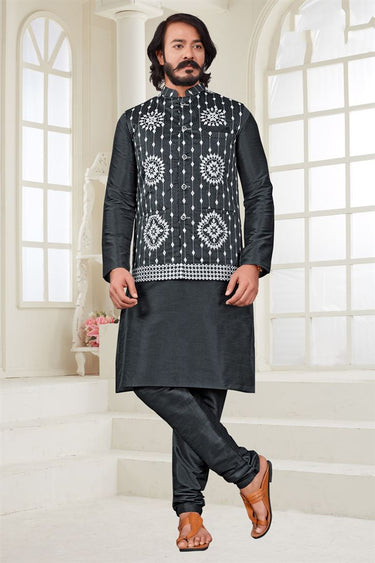 Engaging Grey Color Art Silk Fabric Sangeet Wear Readymade Kurta Pyjama With Designer Jacket